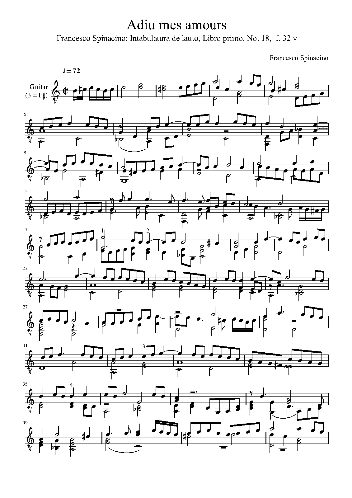 | Extra Information | Francesco Spinacino's intabulation of Josquin's Adieu mes amours,a 4-voice chanson |