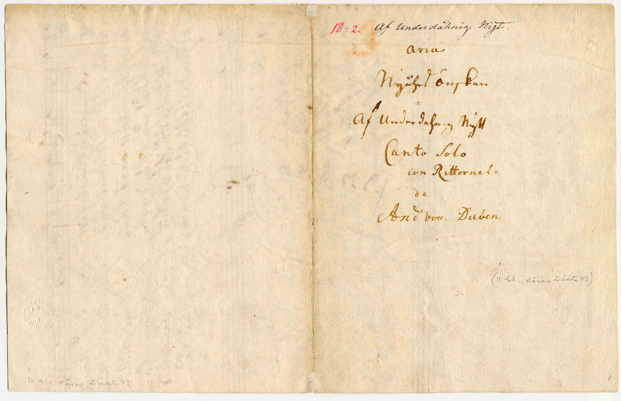 | Instrumentation | soprano, 2 dessus (flute et violon mentioned on continuo part), continuo (3 parts labelled violone, bassoon and basso continuo) |