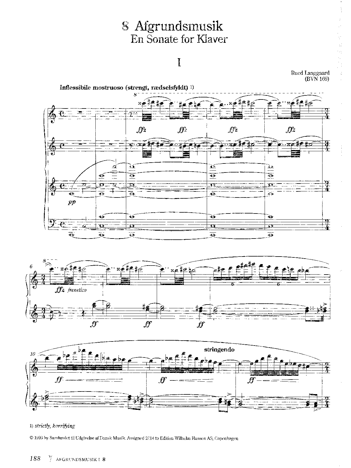| Extra Information | A lost early version in six movements titled Serenata lagunosa was first performed 16 February 1922 by Victor Schiøler. Langgaard reduced this to five movements for the second performance the following month and a third performance by the composer on 16 January 1923 under the title Psalmen des Afgrunds, Suite für Piano. Langgaard then revised the work again in 1924, reducing it to two long movements, completing it 6 January 1924. This definitive final version was first performed in 1967 by Bengt Johnsson and published in 1993 along with Insektarium, BVN 134, which is probably non-PD life+50 as its first performance was in 1977 (i.e., 47 years ago at time of writing). |