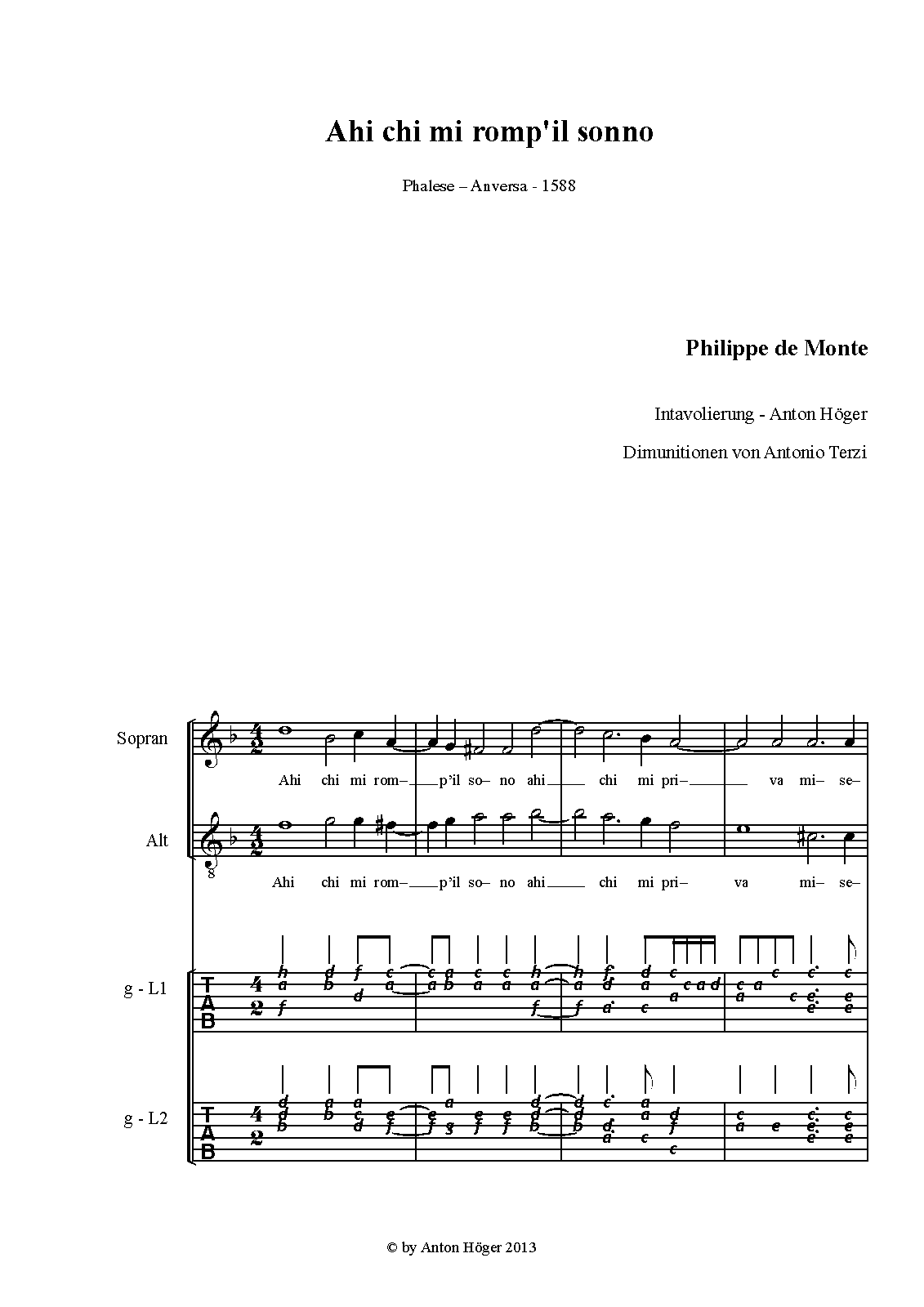 Misc. Notes Intavolation in french Lute-tabulatur for Soprano, Alto and 2 g-Lutes. The original lute Diminutions are by Antonio Terzi (INTAVOLATURA DI LIUTTO DI GIO. ANTONIO TERZI LIBRO PRIMO -1593). If performed I would look forward about a small reference to my efforts.