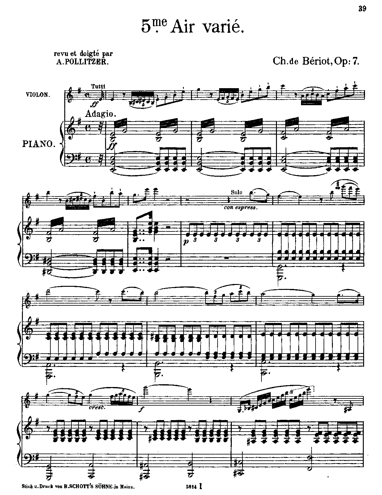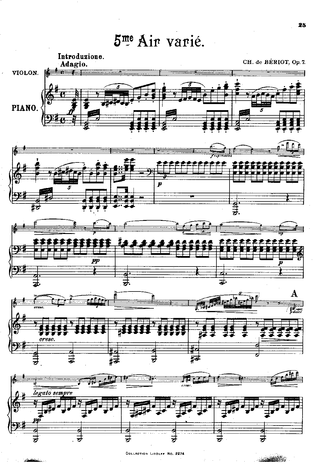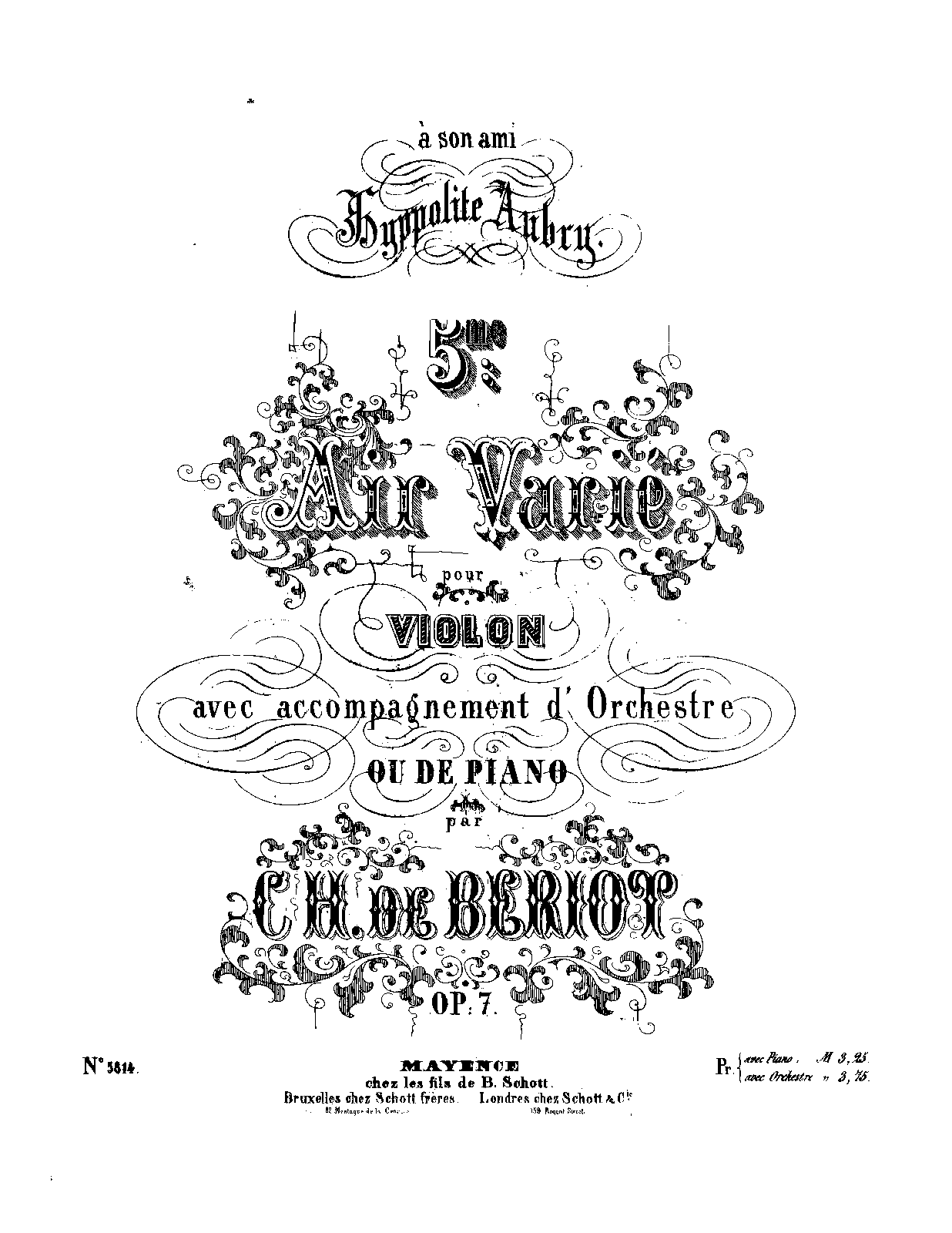 A very similar piece (but with the main theme in the violin, not piano, at least for the opening) was published by Boosey as Bériot's 6th Air and variations, opus 9 ca.1825 (see IArch for the solo part.) In E major with an E minor introduction - hence, E major.