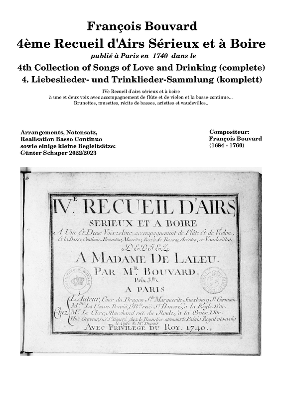 1. voice, flute, continuo (figured) 2. voice (bass clef, no figures) 3. voice (treble clef only, musette presumably works out harmony from unfigured treble line) 4. voice (bass clef, no figures) 5. 2 voices (treble and bass clef, no figures) 6. voice, continuo (figured) 7. voice (bass clef, no figures) 8. voice (treble clef, no figures( 9. voice, flute, continuo (figured) 10. voice (treble clef, no figures) 11. 2 voices (treble and bass clef, no figures) 12. voice (treble clef, no figures) 13. voice (bass clef, no figures) 14. voice (treble clef, no figures) 15. voice (bass clef, no figures) 16. voice, continuo (figured) 17. voice (treble clef, no figures) 18. voice (bass clef, no figures) 19. voice (treble clef, no figures)