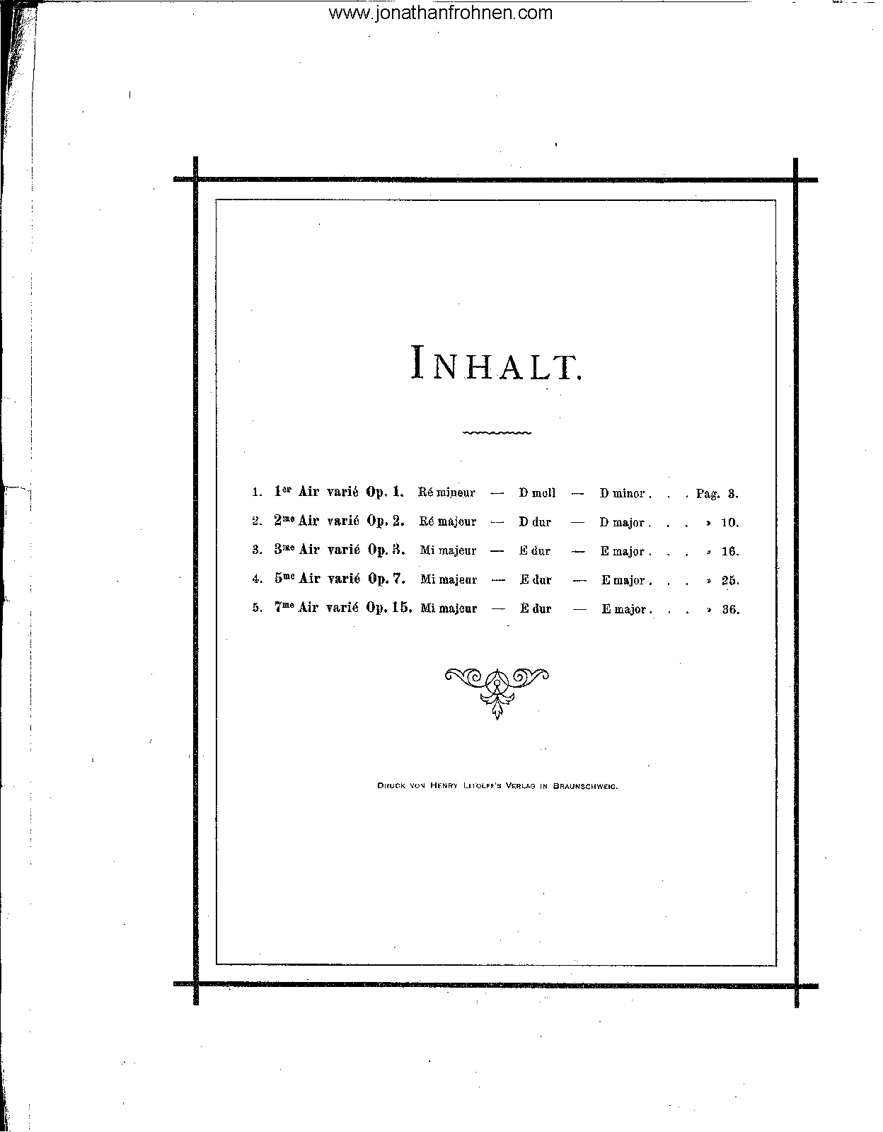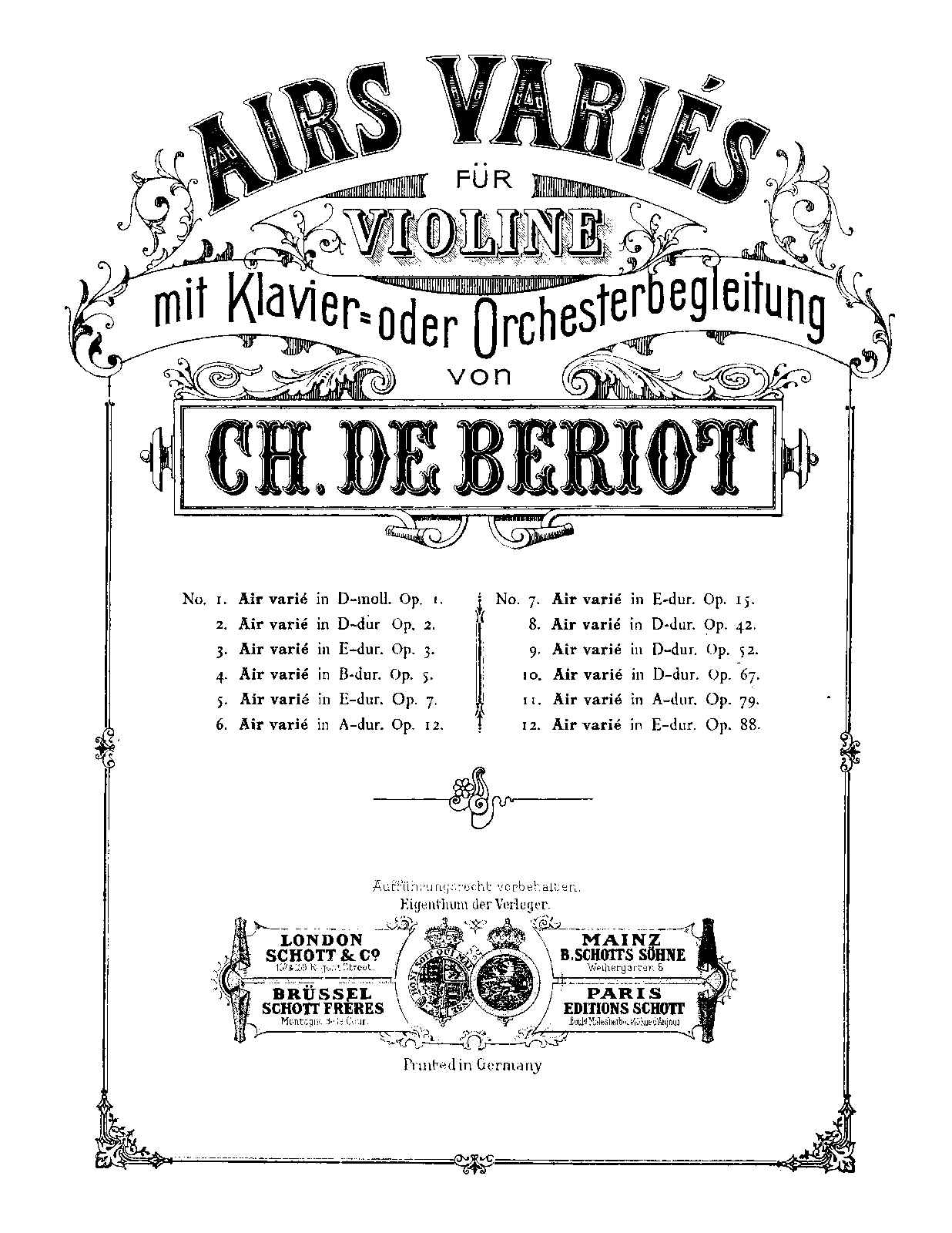 | Extra Information | Op.2 and Op.42 use scordatura tuning ADae. Air varié No.9 (Op.52) published 1845 for violin and piano or orchestra by Troupenas. Publication noted in the Bibliographie de la France 1e série, 34e année (48e de la collection), Nº 51, 20 Décembre 1845, p.667, r.480.. No.10 Op.67 published by Troupenas (with piano or orchestra) in 1850: Publication noted in the Bibliographie de la France 1e série, 39e année (53e de la collection), Nº 21, 25 Mai 1850, p.264, r. 100.. These works were all originally for violin and orchestra; versions for violin and piano should be considered arrangements. Publication: