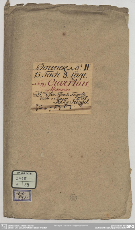 - 2 recorders, 2 oboes, [bassoon], 2 horns, 2 trumpets, strings, continuo (cello, lute, harpsichord)