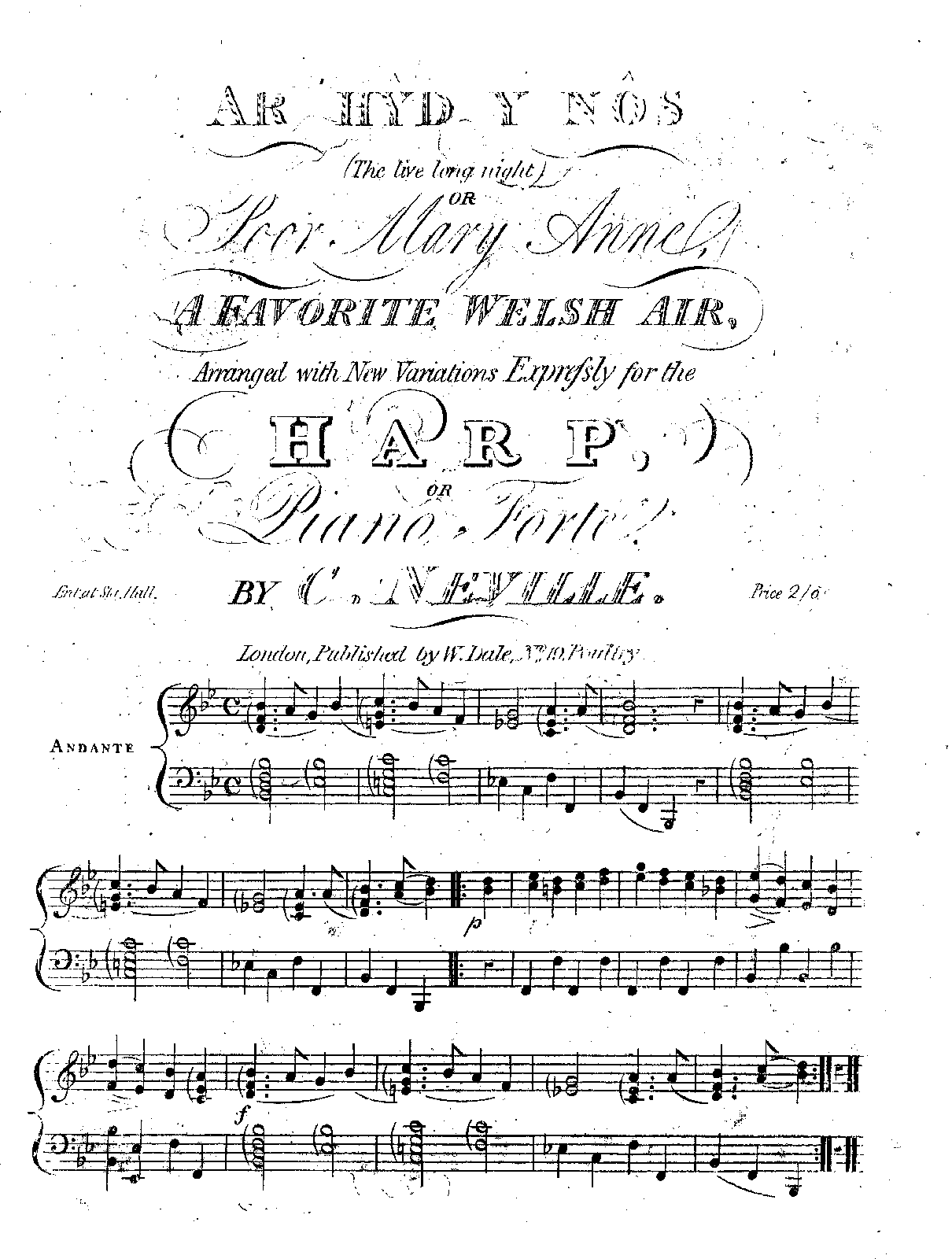 Ar Hŷd y Nôs (The live long night) or Poor Mary Anne, A favorite Welsh Air, arranged with new variations expressly for the harp, or piano forte
