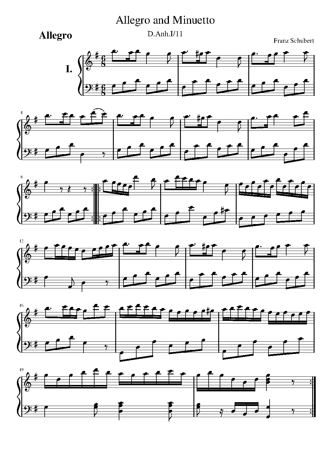 Deutsch notes that both piano pieces, inscribed as "Allegro Ng I" and "Menuetto Ng H", were written by an unknown hand and do not include a composer's name. At the end of the second page, after the final note of the minuet, there is an indication "Volti Trio". However, the trio, which would have apparently followed on the next page, is missing. The work was first published privately as a "Fragment of a Sonatine" ("pro manuscripto") in 1967 by Reinhard van Hoorickx (1918-1997), who composed performing versions for many of Schubert's unfinished works. However, contrary to Hoorickx's assumption, the work was later determined to have been composed by someone other than Schubert.