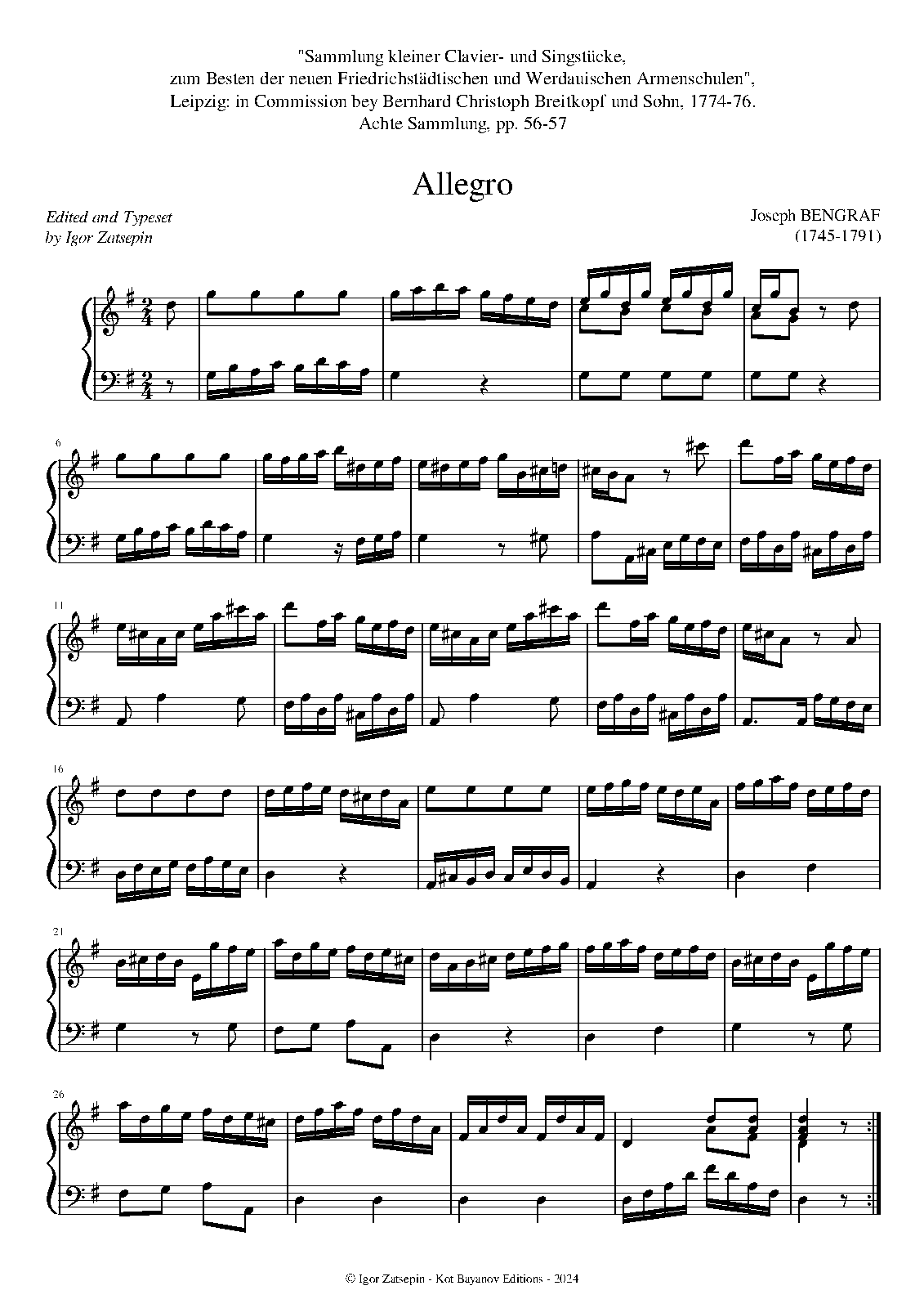| Extra Information | "Sammlung kleiner Clavier- und Singstücke...", Breitkopf und Sohn, 1774-76 |