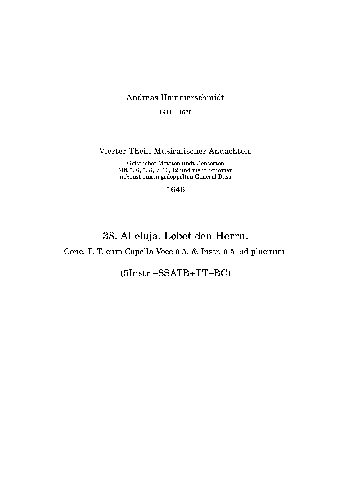 Instrumentation 2 tenors, 2 mixed choruses (SSATB/TT), 5 open instruments (ad placitum), continuo (ad lib.)