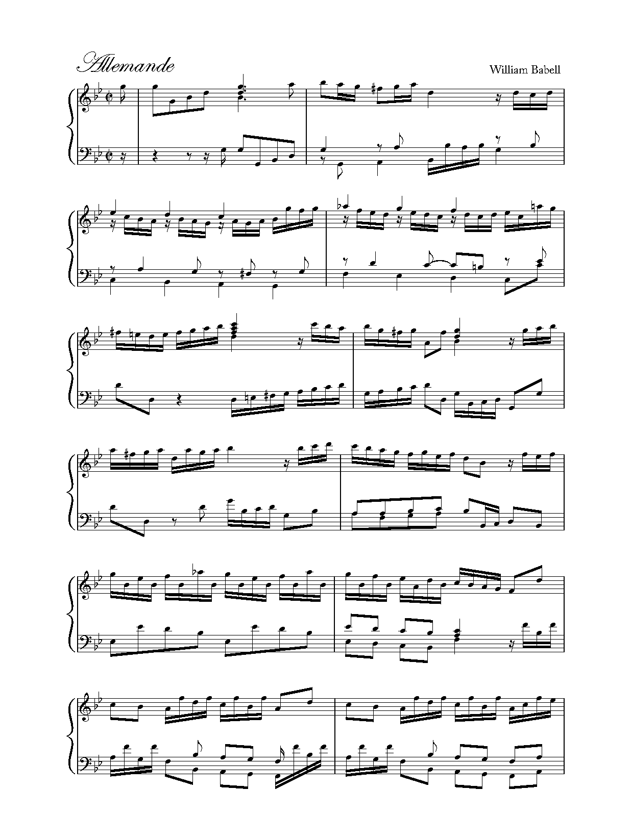 This allemande is from a manuscript in the Biblioteca Musicale Gaetano Donizetti, Bergamo. The Bergamo manuscript contains eleven toccatas, two suites, seven preludes, a single allemande and a fragmentary arrangement of Henry Carey's 'Sally in our alley'. Several concordances suggest Babell’s authorship of most if not all of the music in the manuscript: three of the toccatas are entirely or partially concordant with preludes in Babell’s Suits of Celebrated Lessons, his portion of British Library, Add. MS 71209, or another manuscript in his hand, Foundling Museum, London, Coke 1257. Toccata 11, complete with its short fugue, is the Prelude from the ‘Third Set’ in the Suits, the first movement of Toccata 2 is the Prelude from the ‘First Set’ in the Suits, while Toccata 1's prelude is included in the Babell portion of Add. MS 71209 with a modified ending for the first section. Three of the seven preludes are also concordant or partially concordant with preludes in Coke 1257. Another reason for attributing this music to Babell is its musical style, including its virtuoso passagework, and harmonic and structural characteristics. (Information kindly supplied by Andrew Woolley.)