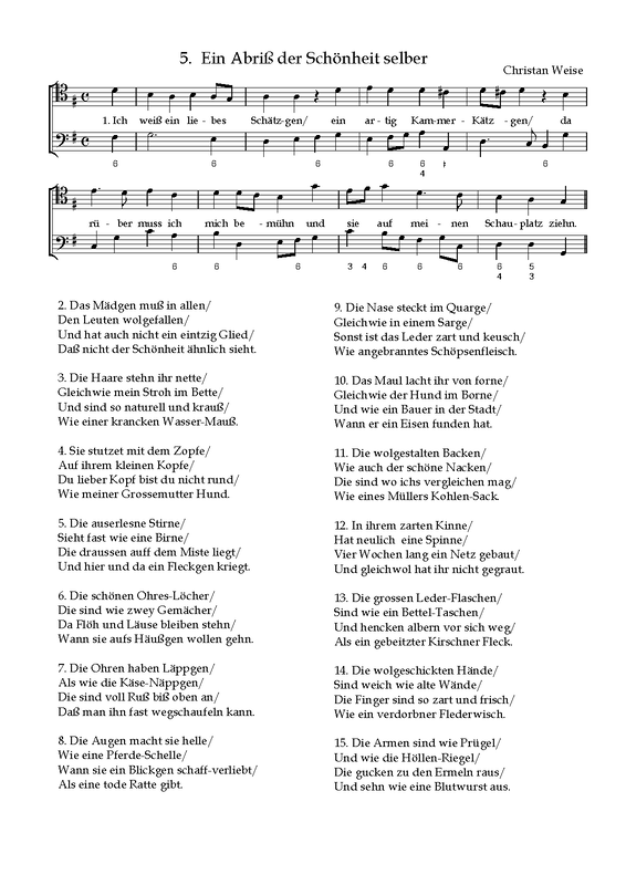 ⇒ 7 more: 5. Ein Abriß der Schönheit selber (G-clef) • 6. Loblied des Feld- und Waldlebens (C-clef) • 6. Loblied des Feld- und Waldlebens (G-clef) • 7. Hylas wil kein Weib nicht haben (C-clef) • 7. Hylas wil kein Weib nicht haben (G-clef) • 8. Wider-Ruff (C-clef) • 8. Wider-Ruff (G-clef)