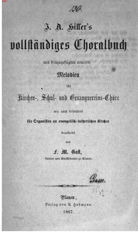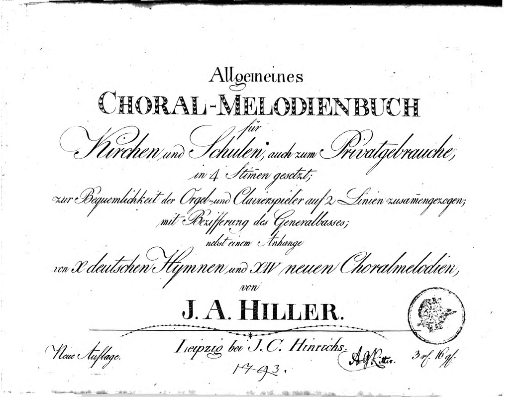 Allgemeines Choral-Melodienbuch für Kirchen und Schulen, auch zum Privatgebrauche, in vier Stimmen gesetzt; zur Bequemlichkeit der Orgel- und Clavierspieler auf zwo Linien zusammengezogen; mit Bezifferung des Generalbasses, von Johann Adam Hiller ; Nachtrag zum allgemeinen Choral-Melodienbuche für Kirchen und Schulen, zur Beförderung des Choralstudiums, von Johann Adam Hiller ; Anhang zum allgemeinen Choral-Melodienbuche; enthaltend X Deutsche Hymnen zu den Festtagen und XIV neue Choralmelodien [...]