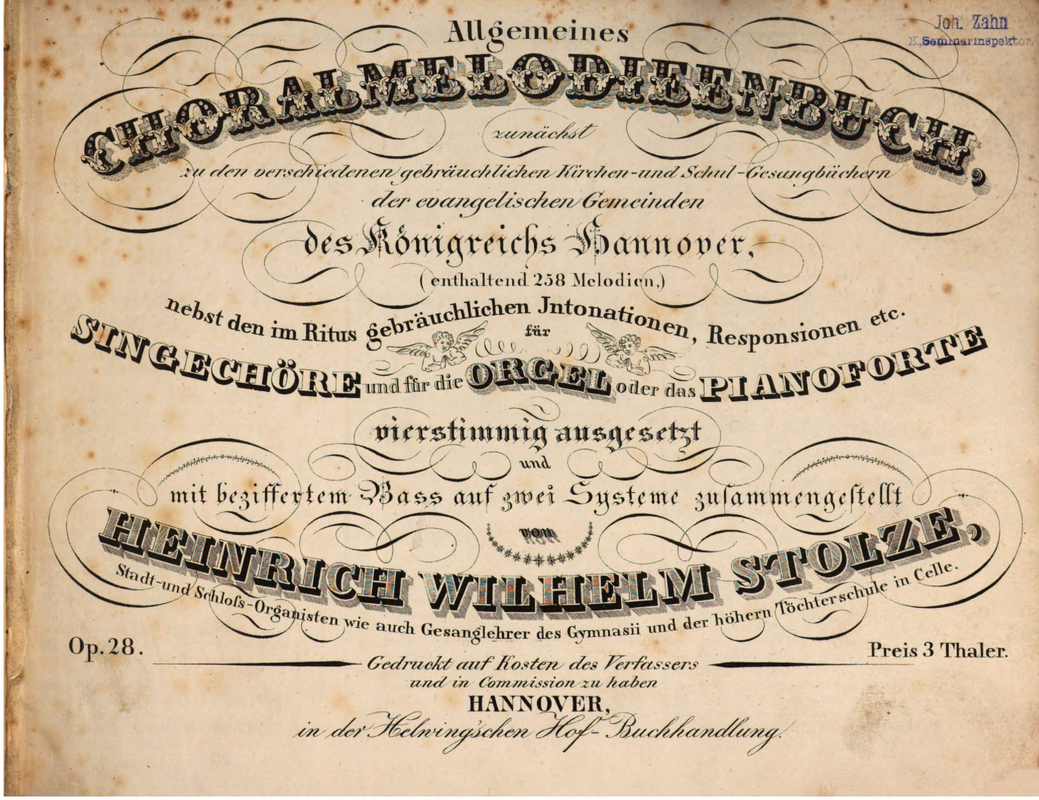 | Alternative. Title | Allgemeines Choralmelodienbuch, zunächst zu den verschiedenen gebräuchlichen Kirchen- und Schul-Gesangbüchern der evangelischen Gemeinden des Königreichs Hannover, (enthaltend 258 Melodien) nebst den im Ritus gebräuchlichen Intonationen, Responsionen etc. für Singechöre und für die Orgel oder das Pianoforte vierstimmig ausgesetzt und mit bezifferten Bass auf zwei Systeme zusammengestellt von Heinrich Wilhelm Stolze, Stadt- und Schloß-Organisten wie auch Gesanglehrer des Gymnasii und der höhern Töchterschule in Celle |