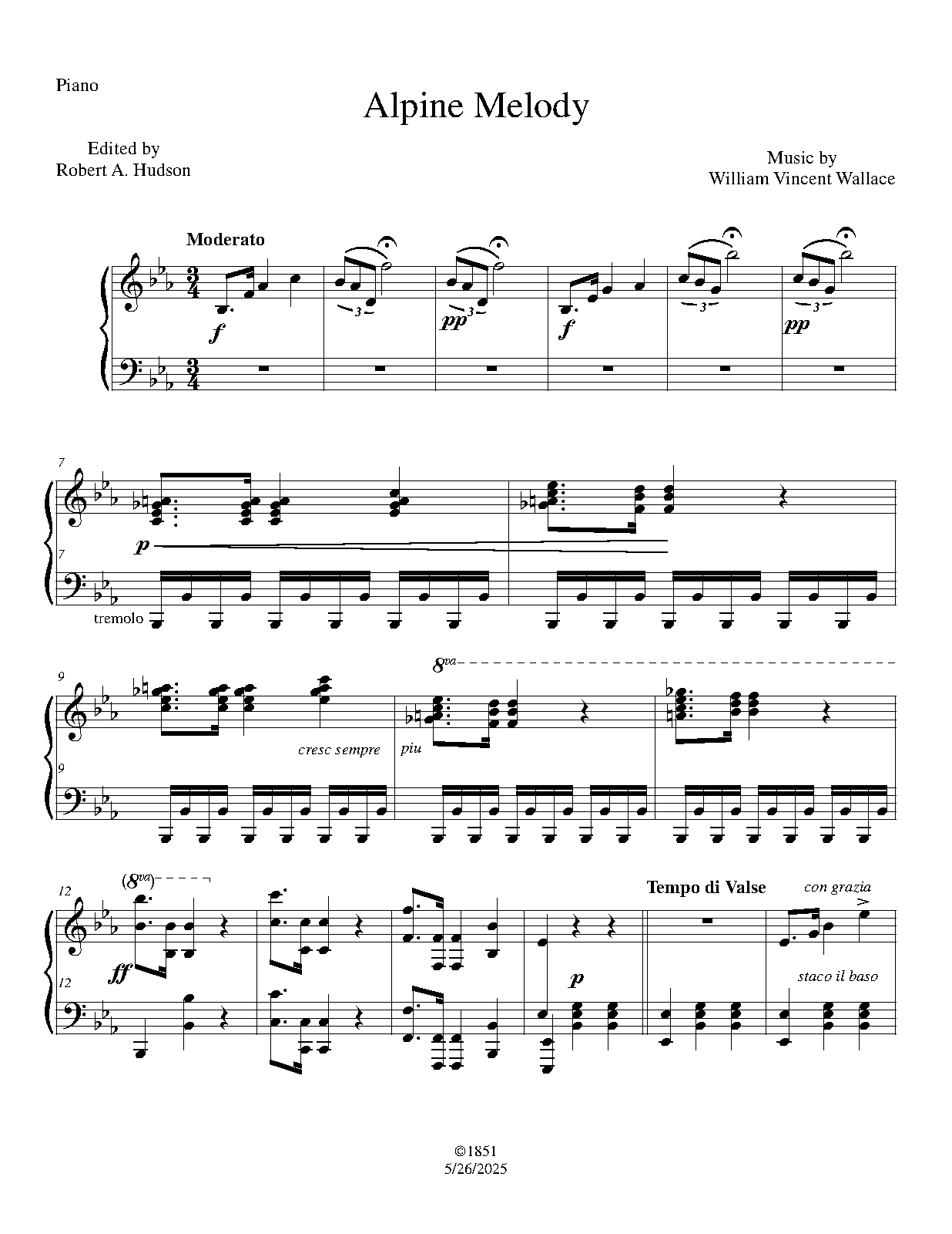| Extra Information | Wallace also composed a work for piano, My alpine home : an alpine melody published by Firth, Pond & Co. around 1851–1852 (plate 1711) - does anyone know if this is a closely related work? U. Mich. at Ann Arbor has the score. - Schissel (Worldcat also lists another Wallace Alpine Melody which may be-- guessing is-- the same as this one, published by R. Cocks of London in the 1850s (U. Glasgow has a copy of this edition.)) |