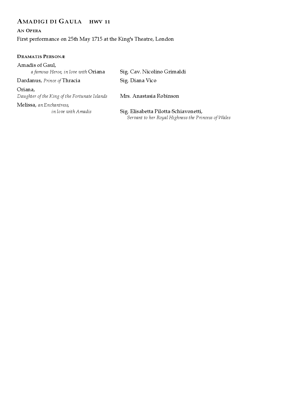 Anastasia Robinson (Oriana) Elisabetta Pilotti-Schiavonetti, called "Pilotti" (Melissa) Diana Vico (Dardano) Caterina Galerati? (Orgando)