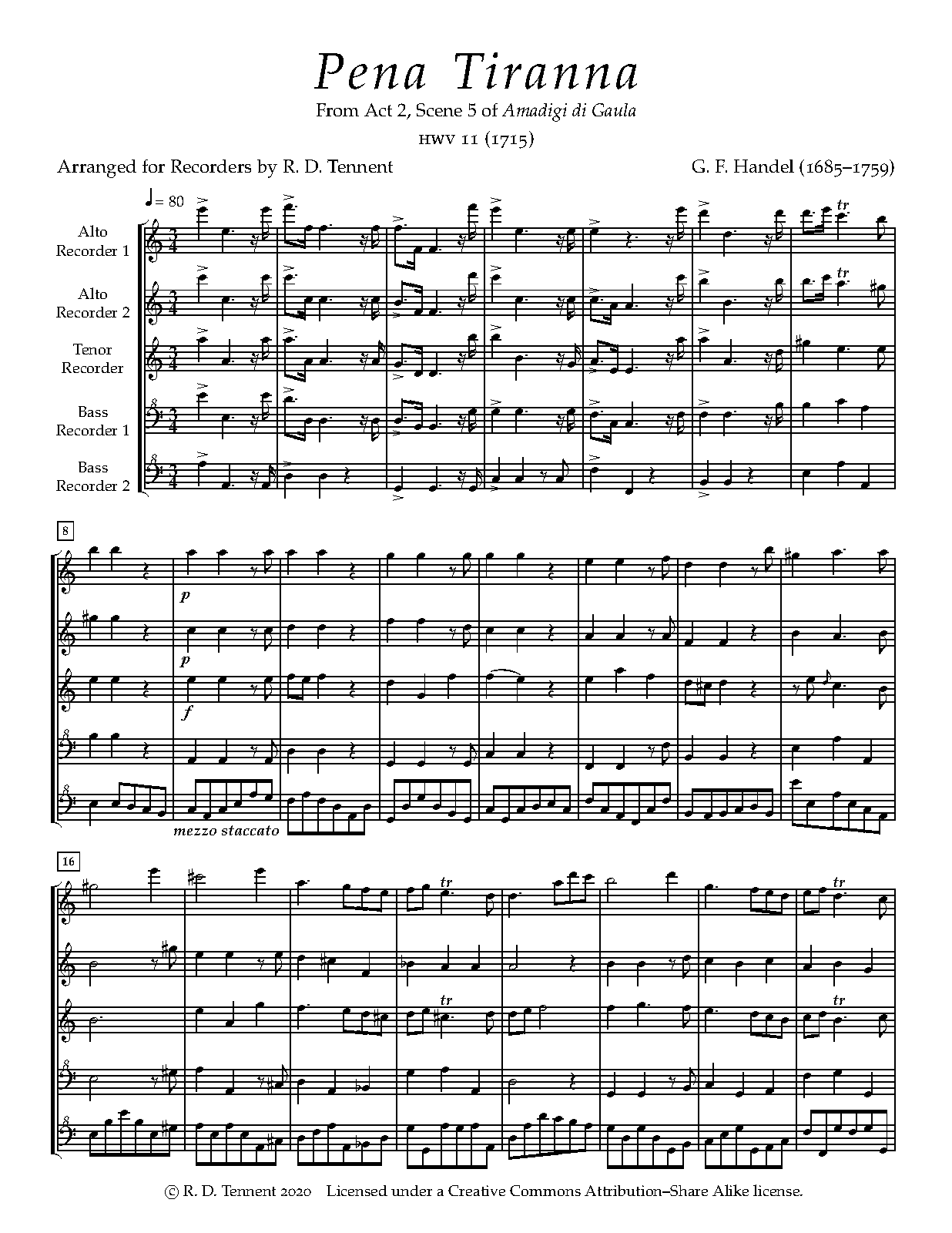 - 2 recorders, 2 oboes, bassoon, trumpet, strings, continuo (cello, lute, harpsichord)