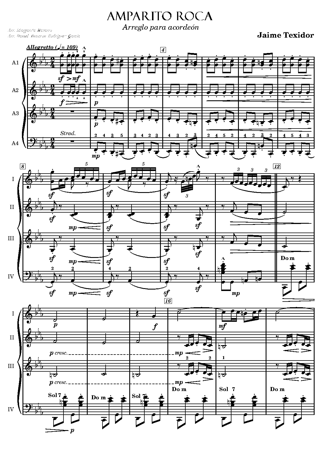 | Extra Information | Spanish march. Named after one of the composer's piano students. The original instrumentation is unknown, although Teixidor's biography on Wikipedia mentions that the original was published in 1925 in Madrid by Música Moderna, so tagging is subject to correction if that is ever uploaded. Teixidor conducted a band at some point, so it is likely written for whatever the instrumentation in that band was. |