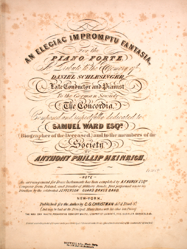 A tribute to the memory of Daniel Schlesinger (1799–1839), late conductor and pianist to the German Society the Concordia Respectfully dedicated to Samuel Ward Esqr. (Biographer of the Deceased [Daniel Schlesinger : the pianist]) and to the members of the society [Concordia]