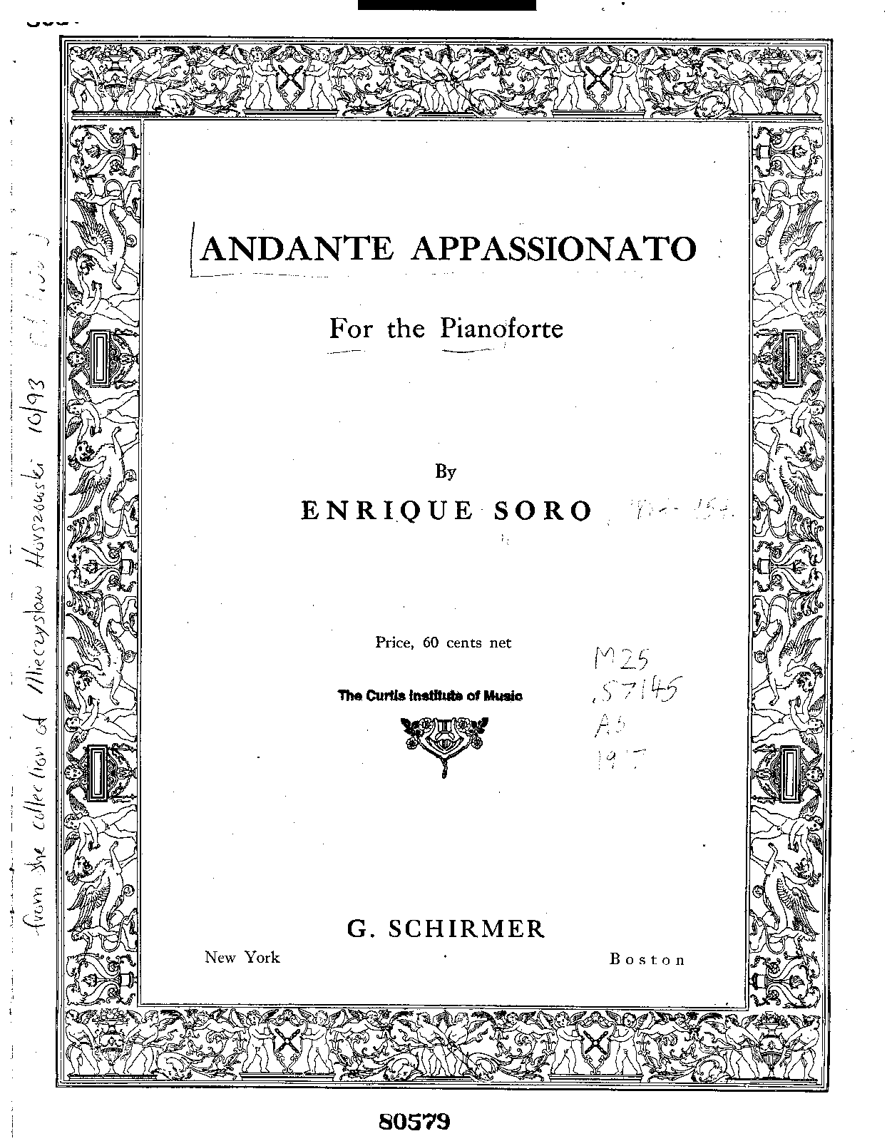 La página romántica de extraordinaria fuerza Ãntima que es el Andante Appassionato Opus 2, tiene una curiosa historia que ha sido mencionada antes. Lo compuso Enrique Soro a la edad de 17 años, cuando era estudiante en Europa. Lo escribió primeramente para cello y órgano y fue interpretado por él mismo en 1901 en el Conservatorio de Milás, con clamoroso éxito, según las crónicas italianas.