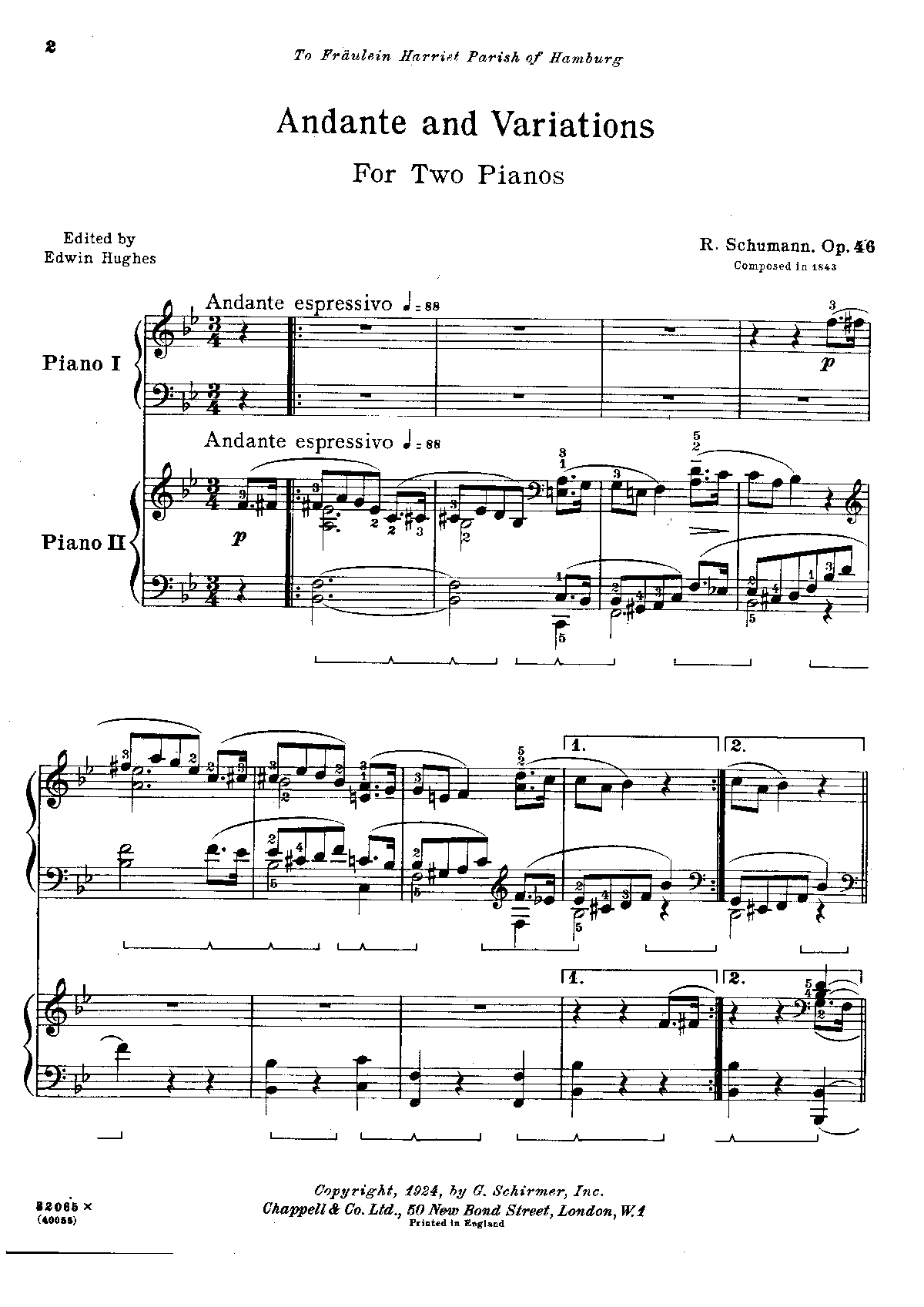 Composed in 1843 for horn, 2 cellos and 2 pianos (WoO 10). Arranged later that year for 2 pianos, published as Op.46.
