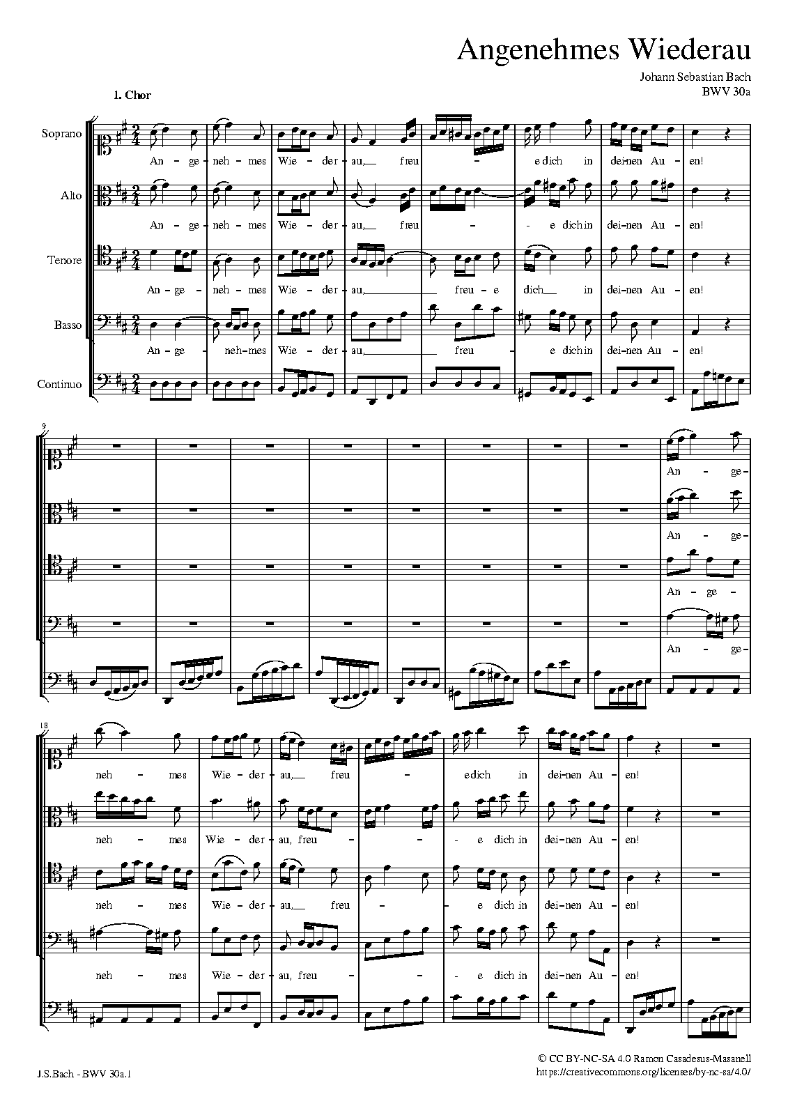 13 more: 2. Recitativo: 'So ziehen wir' • 3. Aria: 'Willkommen im Heil, willkommen in Freuden' • 4. Recitativo: 'Da heute dir, gepriesner Hennicke' • 5. Aria: 'Was die Seele kann ergötzen' • 6. Recitativo: 'Und wie ich jederzeit bedacht' • 7. Aria: 'Ich will dich halten' • 8. Recitativo: 'Und obwohl sonst der Unbestand ' • 9. Aria: 'Eilt, ihr Stunden, wie ihr wollt' • 10. Recitativo: 'So recht! ihr seid mir werte Gäste' • 11. Aria: 'So, wie ich die Tropfen zolle' • 12. Recitativo: 'Drum, angenehmes Wiederau' • 13. Aria: 'Angenehmes Wiederau' • Engraving files (MuseScore)