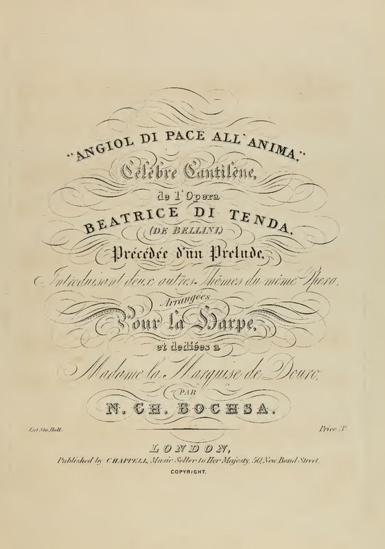 | Alternative. Title | "Angiol di Pace all'anima," celebre cantilene, de l'opera Beatrice di Tenda (de Bellini), précédé d'un Prelude, introduisant deux autres themes du meme opera, arrangees pour la harpe |