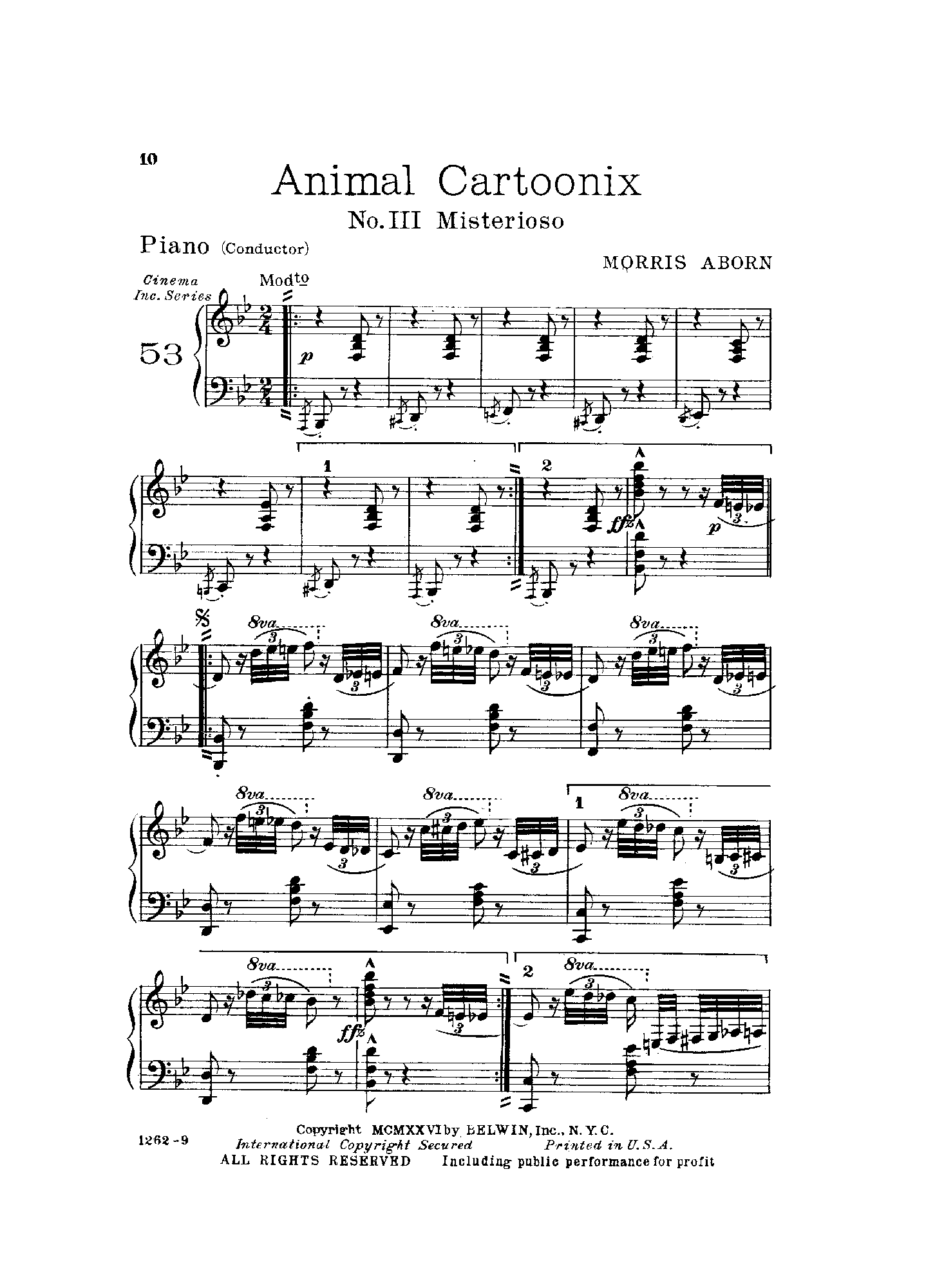 Intended for use as accompaniment for silent movies. Published under the pseudonym Morris Aborn.