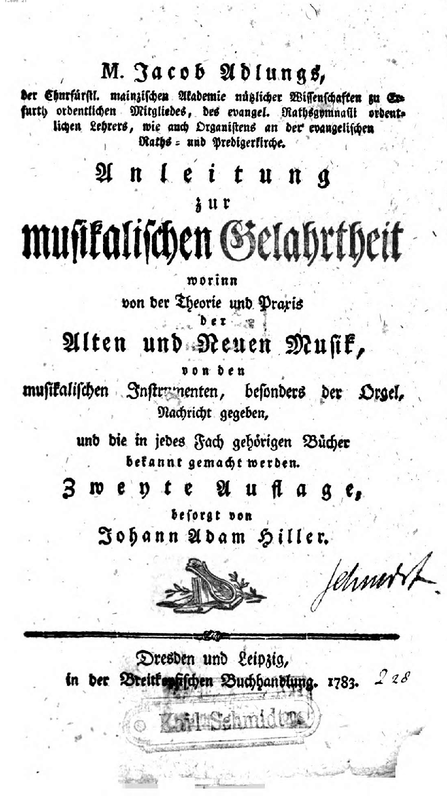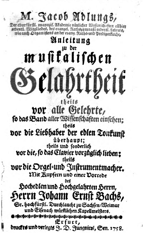 - M. Jacob Adlungs ... Anleitung zu der musikalischen Gelahrtheit: theils vor alle Gelehrte, so das Band aller Wissenschaften einsehen; theils vor die Liebhaber der edlen Tonkunst überhaupt; theils und sonderlich vor die, so das Clavier vorzüglich lieben; theils vor die Orgel- und Instrumentenmacher. Mit Kupfern und einer Vorrede des ... Johann Ernst Bachs ...</span>