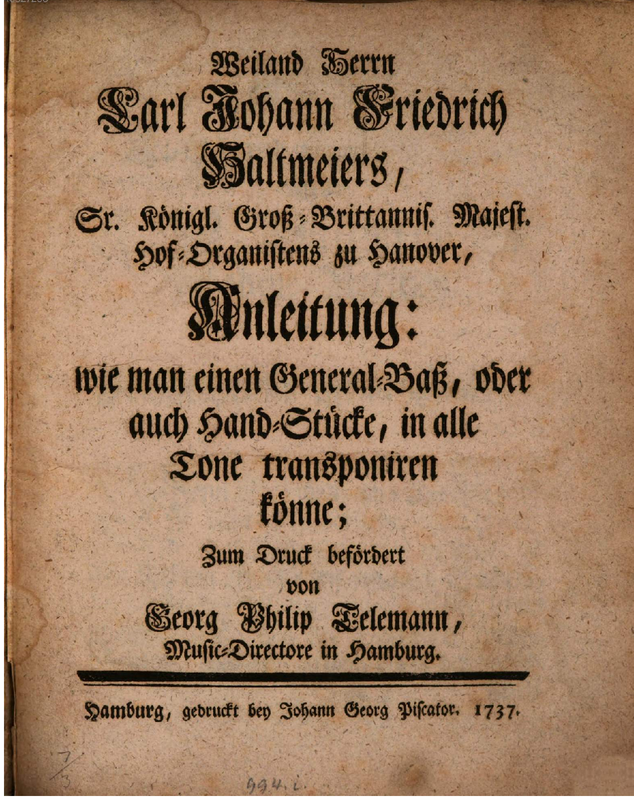Weiland Herrn Carl Johann Friedrich Haltmeiers ... Anleitung: wie man einen General-Baß, oder auch Handstücke, in alle Tone transponiren könne; zum Druck befördert von Georg Philipp Telemann. Anleitung zum Transponiren