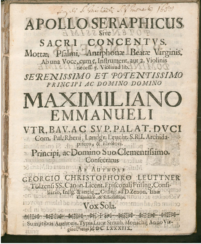 | Alternative. Title | Apollo Seraphicus sive Sacre Concentvs. Mottae. [sic] Psalmi. Antiphonae Beatae Virginis. Ab una Voce, cum 5. Instrument. aut 2. Violinis necess. 3 Violis ad lib. |