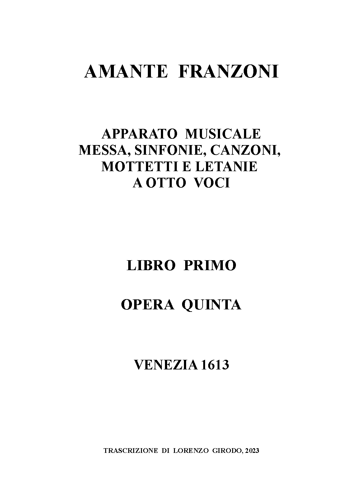Apparato musicale di messa, sinfonie, canzoni, motetti, & letanie della Beata Vergine. A otto voci. Con la partitura de bassi, & un novo ordine, con che si mostra, come, & con l'stromenti, & senza si possa a nell'organo rappresentare. Opera quinta.