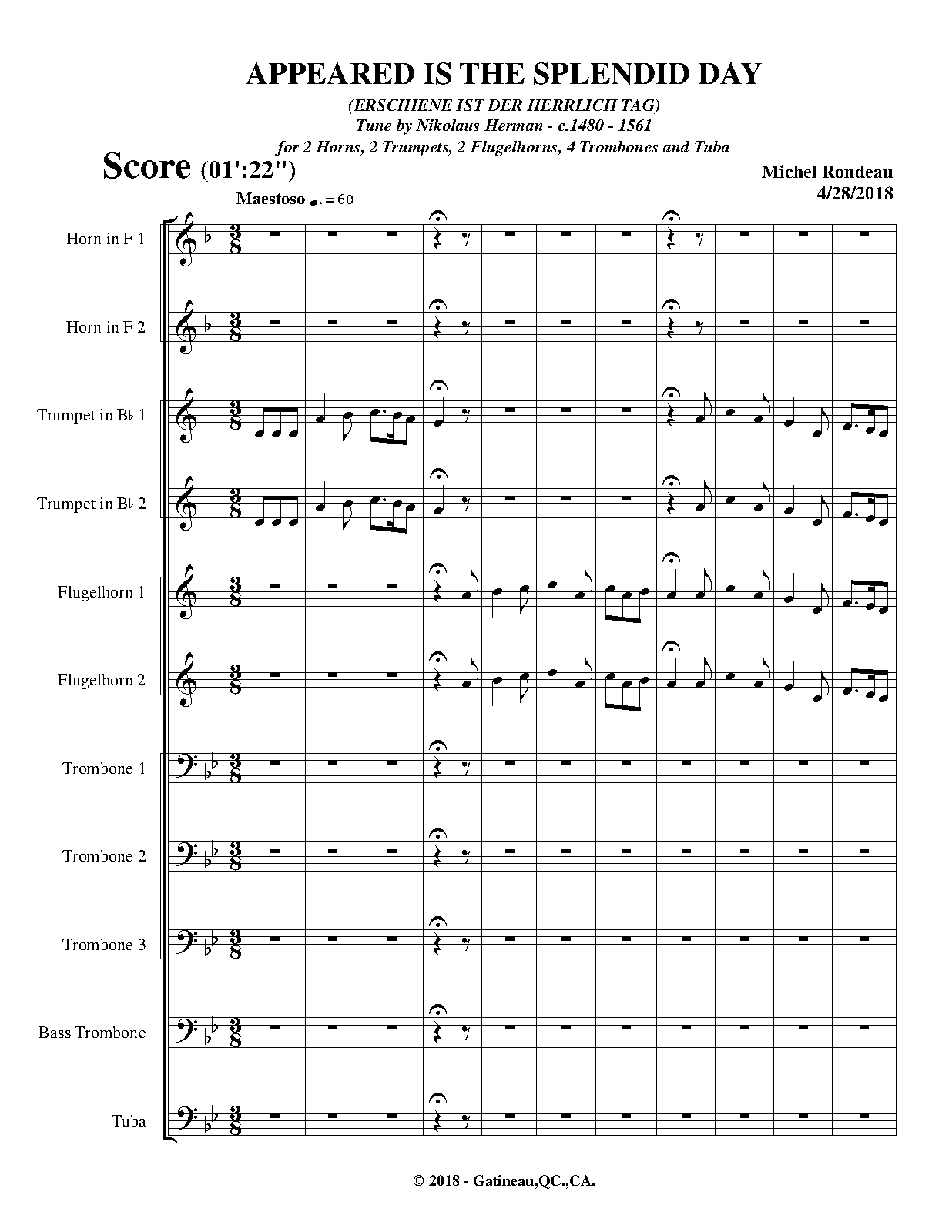 | Genre Categories | Pieces; For 2 horns, 2 flugelhorns, 2 trumpets, 4 trombones, tuba; Scores featuring the horn; |