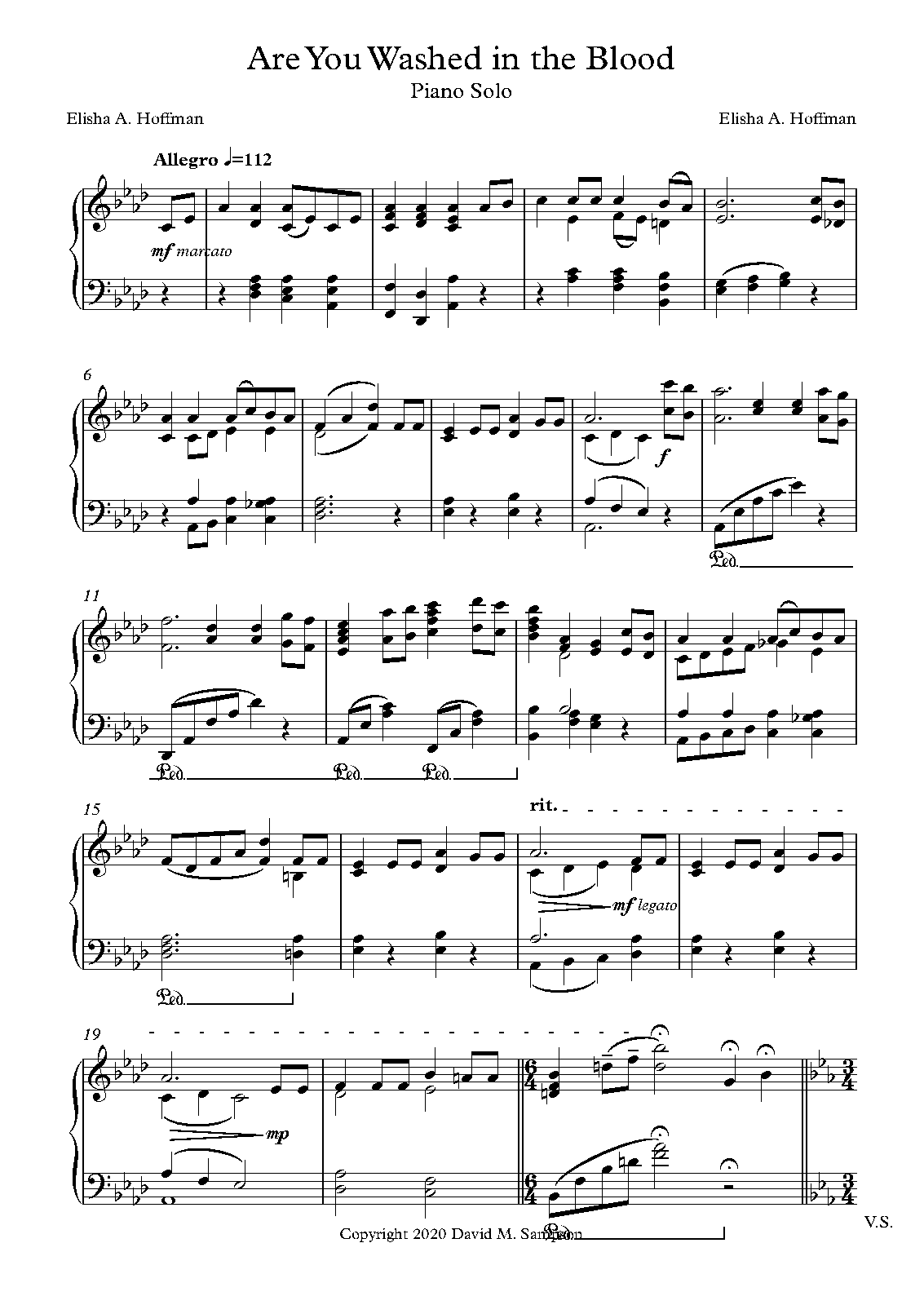 The earliest publication of this seems to be 1887 or 1889 (depending which of the original volumes it was in) of Triumphant Songs edited by Edwin Othello Excell. In that publication, the scoring is 4 voices in keyboard format (so, possibly with keyboard accompaniment). Tagging is therefore subject to correction, should we get a copy of the 1878 version for comparison.