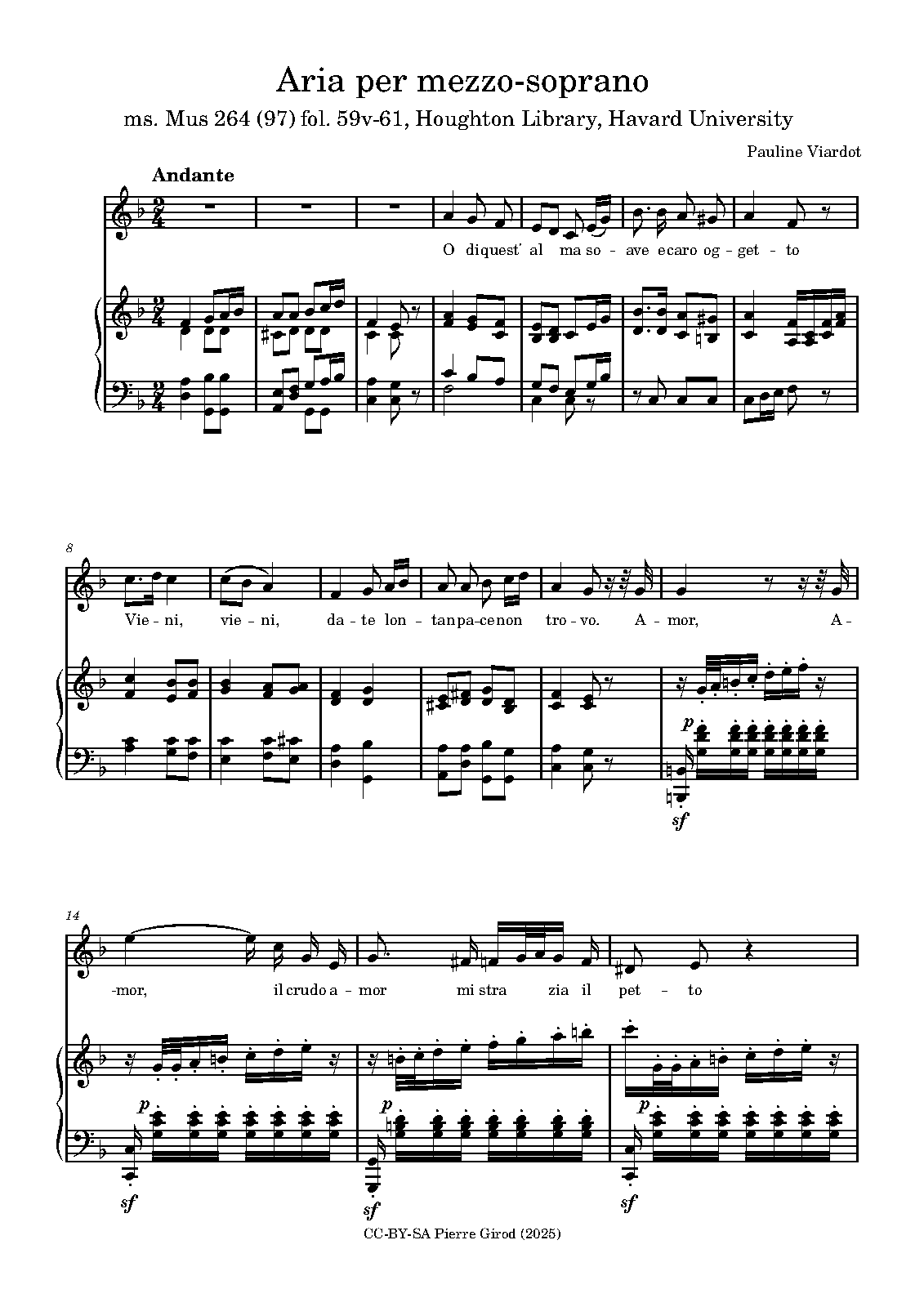 Viardot is said to have been involved alongside Osborne with Bériot's variazioni for violin, and she probably composed this aria around the same time the latter published one on the same text, intended for the famous prima donna Henriette Sontag - whom he courted before marrying Maria Malibran, Viardot's elder sister. As for the music, dilettanti are forced to acknowledge the strong recollection of the last part of the aria Deh per questo istante sung by Sesto in La Clemenza Di Tito. Viardot worshipped Mozart enough to buy the manuscript of Don Giovanni, an opera which her father (title-role), mother (as Elvira), brother (Leporello) and sister (Zerlina) had performed in New-York in 1826.