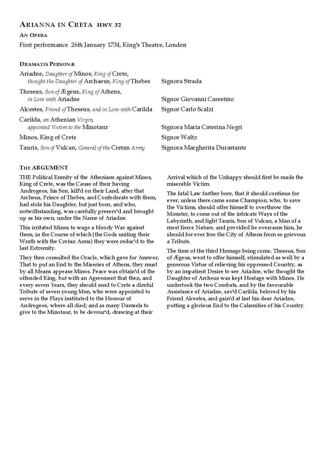 | First Performance. | 1734 in London, King's Theatre in the Haymarket |