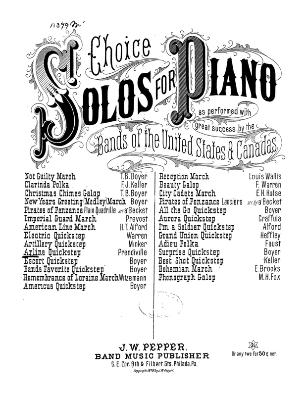 The front cover of the Pepper publication has 1878, the inside has 1881 (when there is disagreement usually it's in the reverse order.) At a guess the cover was made before the works were arranged for piano (there is reason from the description to believe so- it describes them as performed by band, not piano. This may well be their first published form in some cases.) This particular work may have been performed under a different name (references to "Arline Quickstep" or similar, in contemporary journals and publications seem few if any?)