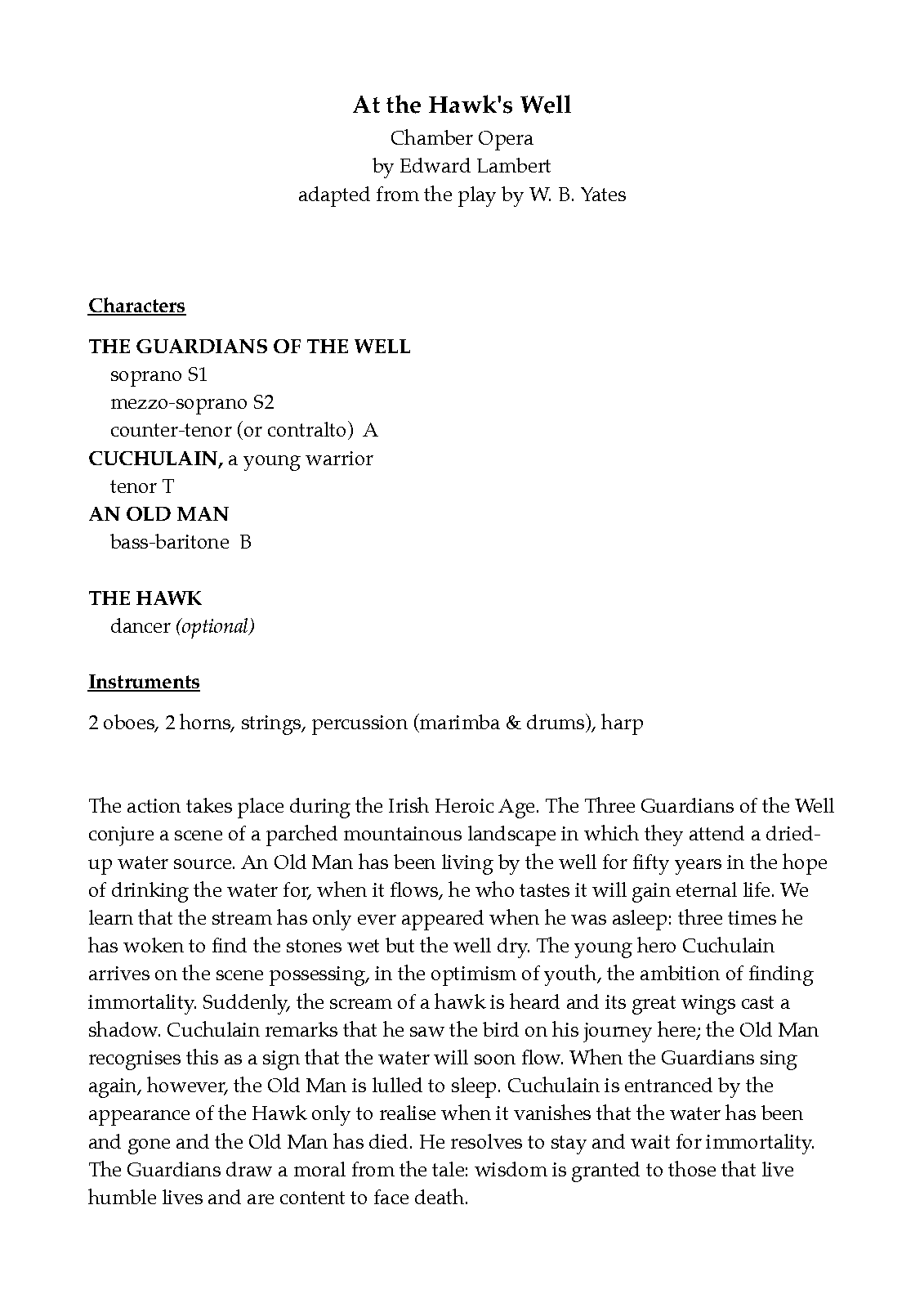 THE GUARDIANS OF THE WELL soprano S1 mezzo-soprano S2 counter-tenor (or contralto) A CUCHULAIN, a young warrior tenor T AN OLD MAN bass-baritone B