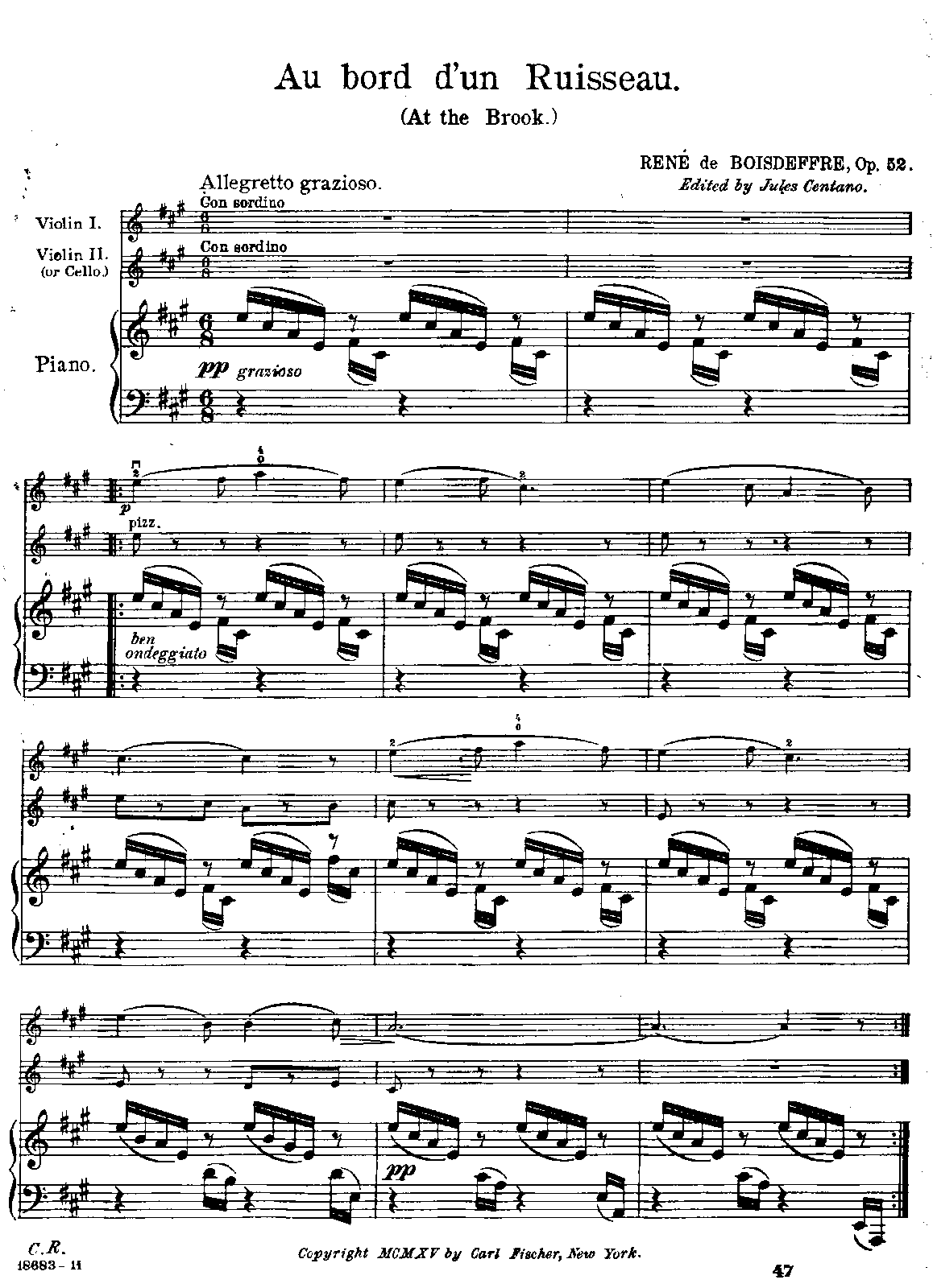 Publication noted in the Bibliographie de la France 2e série, 87e année, Nº 21, 21 Mai 1898, p.425, r.2436. - notes publication of Bord d'un ruisseau, sérénade champetre pour orchestre par Boisdeffre.