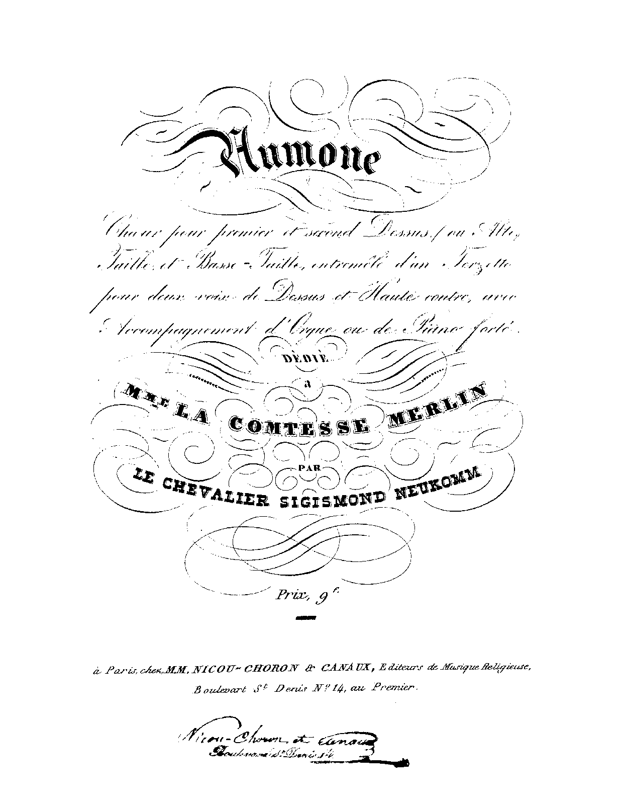 | Extra Information | Aumone : choeur pour 1 et 2 dessus (ou alto), taille et basse-taille, entremele d'un terzetto pour 2 voix de dessus et haute contre, avec acomp. d'orgue ou de pianoforte |