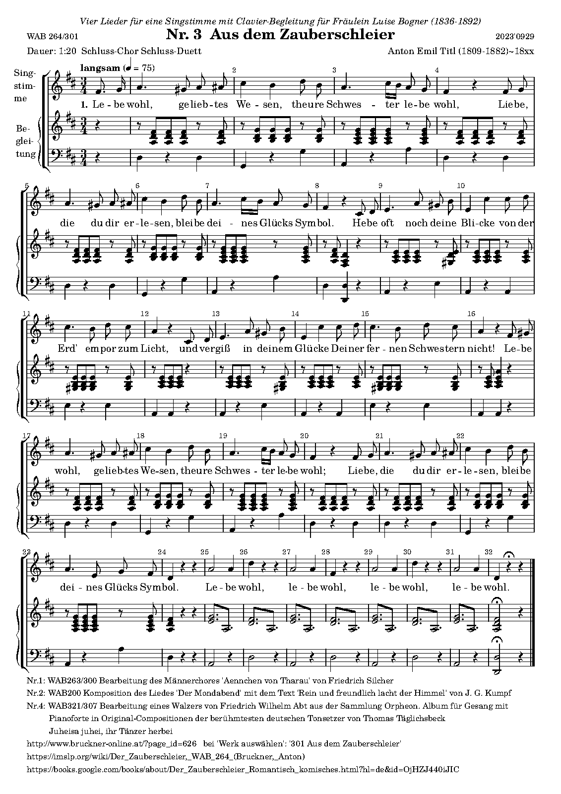 | Extra Information | Number 3 of 4 Lieder. From the Opera 'Der Zauberschleier' of Anton Emil Titl. Lebe wohl, geliebtes Wesen, theure Schwester, lebe wohl. Liebe,
