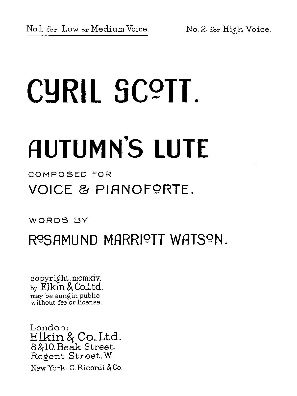 Publisher. Info. London: Elkin & Co., 1914. Plate E. & Co. 788.