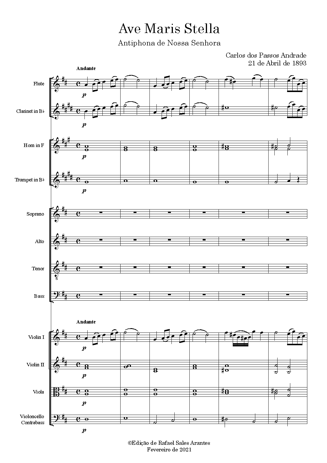 Voices: mixed chorus (SATB) Orchestra: flute, clarinet (B♭), 2 horns (F), trumpet (B♭), strings