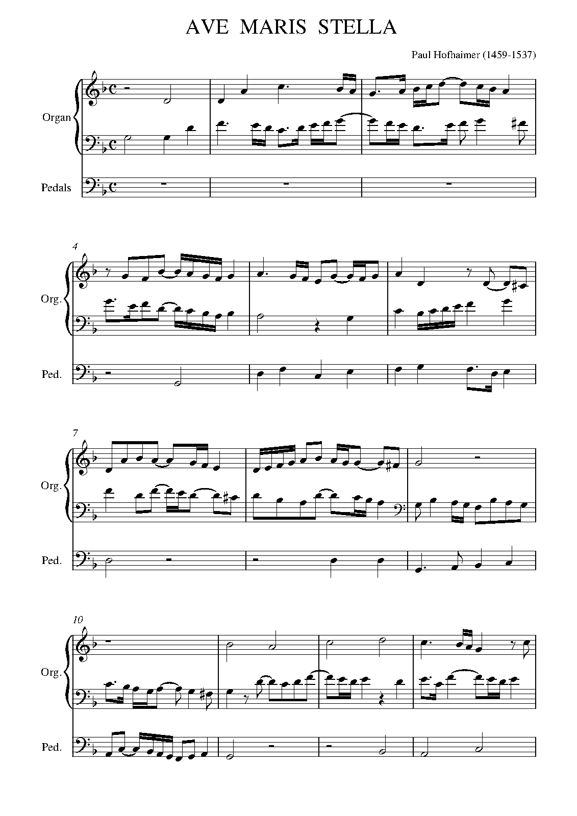 According to Grove Music, much of Hofhaimer's music has not survived, particularly his organ works. "Only two of Hofhaimer's liturgical organ compositions have survived, Recordare and Salve regina". Grove lists an Ave Maris Stella for 3 voices, and it is unclear if this work is an arrangement of that one. Until more information is found, or a scan of the Ave Maris Stella is uploaded, it is assumed this is that work, and the organ version is an arrangement.