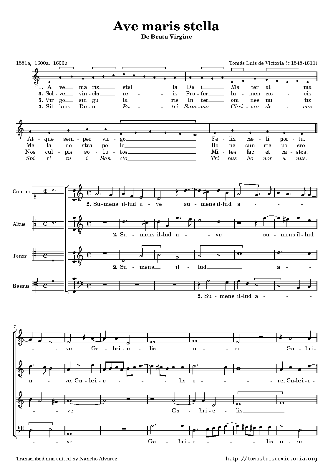 There is a seeming discrepancy in Victoria having published an even verse setting of the famous Marian hymn Ave maris stella in his 1581 Hymni totius anni, and then including it again identically in his 1600 Venetian hymn collection (1600b). According to Nancho Álvarez, the setting in the 1600a Madrid collection of his large multiple choir works consists of only a single even verse (Sumens illud ave); so why has Pedrell produced four different odd verses ascribed to one of the 1600 prints? It seems unlikely Victoria intended the two versions (if he even is responsible for the odd verses) to be sung together, all seven verses sung as polyphony. The table below indicates which scores include what musical material (since Pedrell omits plainsong).