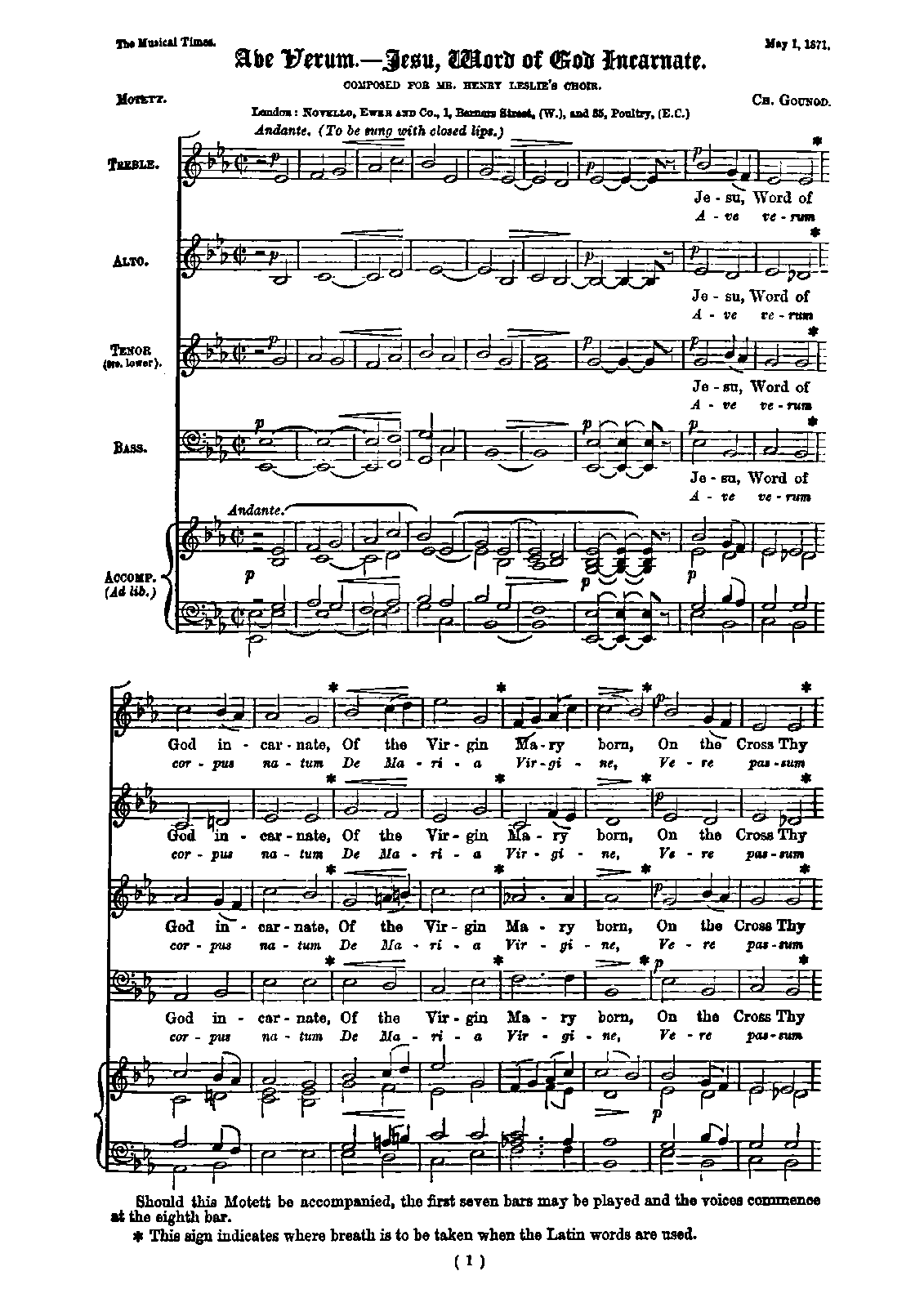 | Extra Information | This is not the only "Ave Verum" that Gounod wrote (forgetting isomorphism of key) - see (just!) e.g. RISM 700010825, or see the worklist at the official site which lists several (composed in 1853 (pub.1854 and 1863), 1856 (pub.1857), 1861 (pub.1863), 1861 (pub.1864), 1871 (in English, pub. by Novello), 1876.) So disambiguation of the title is necessary (if anything, insufficient, but nothing to be done about that. Probably better to delete and start over than to redirect, in such cases. - Schissel |