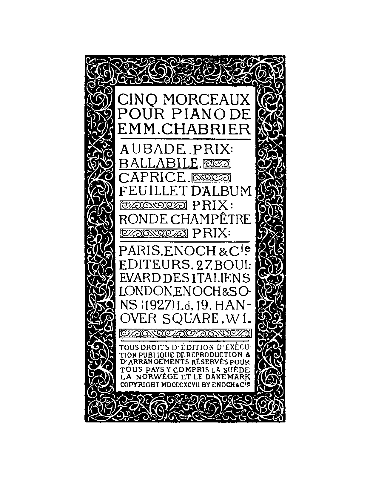 First Publication. 1897 – Paris: Enoch & Cie. in Cinq Morceaux pour piano (No.2)