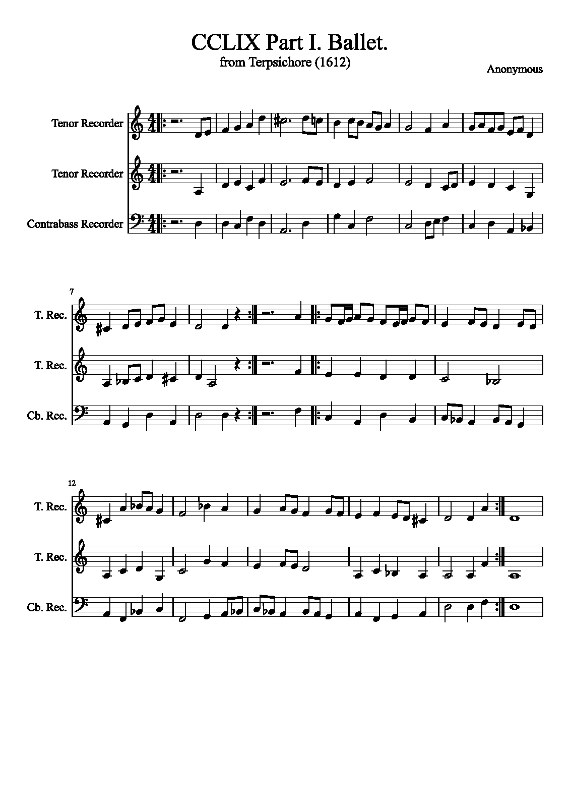 | Extra Information | These pieces were assembled and arranged by Praetorius for his 1612 collection. It is unknown how many, or if any, of the works in the collection were actually composed by Praetorius as opposed to being popular dance tunes arranged by him. The instrumentation is not specified in the original, and simply listed as "Ã 3". |