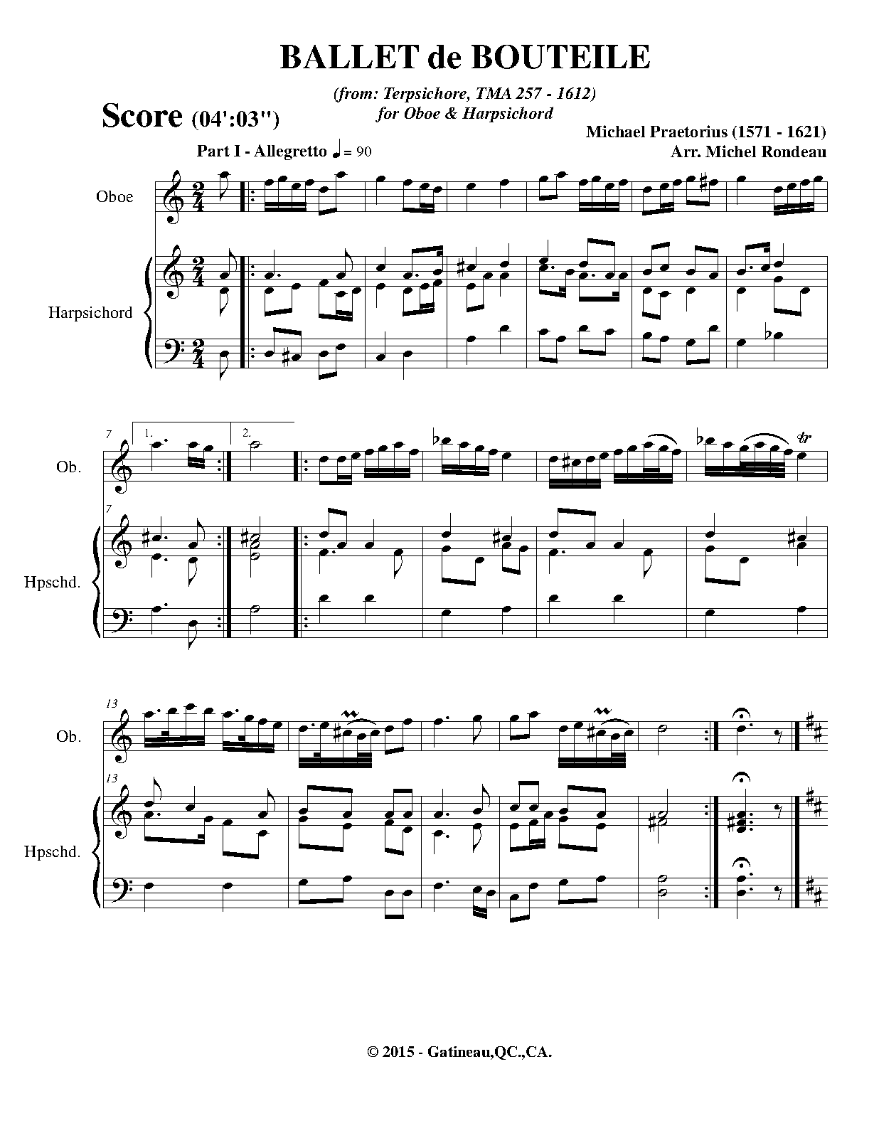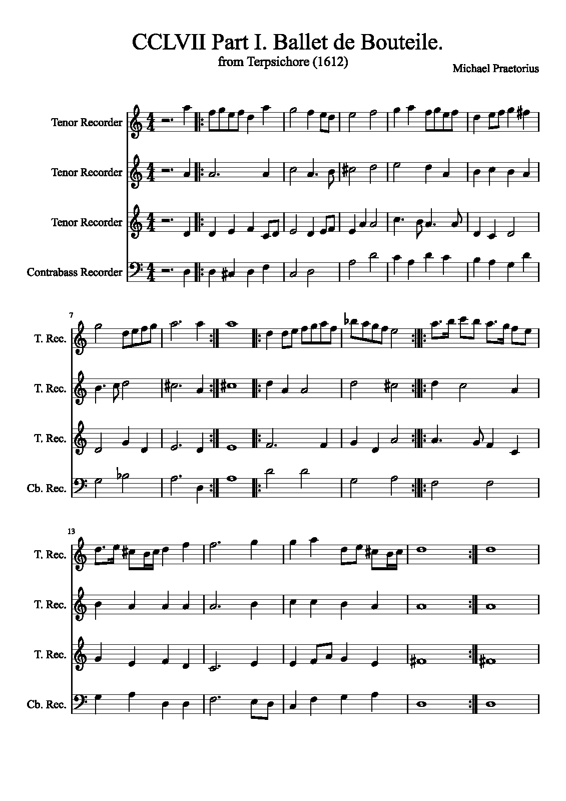 | Extra Information | These pieces were assembled and arranged by Praetorius for his 1612 collection. It is unknown how many, or if any, of the works in the collection were actually composed by Praetorius as opposed to being popular dance tunes arranged by him. The instrumentation is not specified in the original, and simply listed as "à 4". |