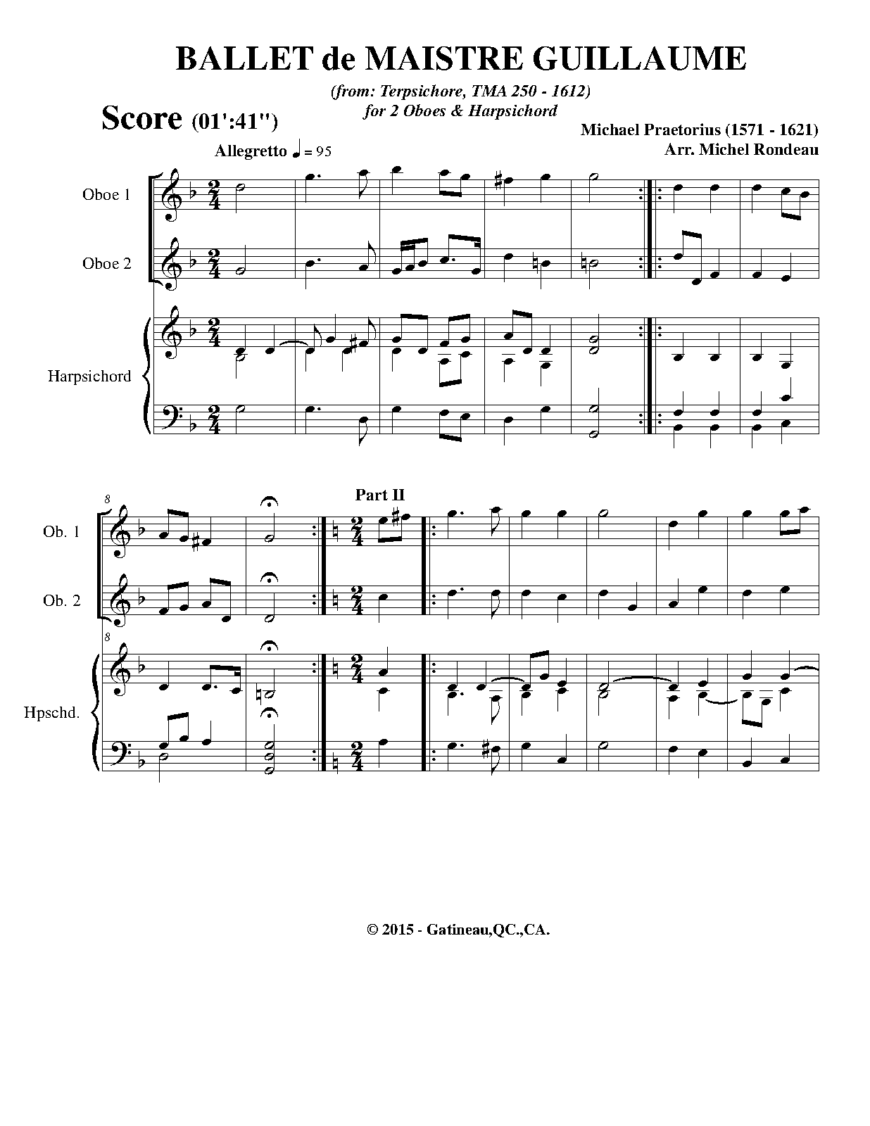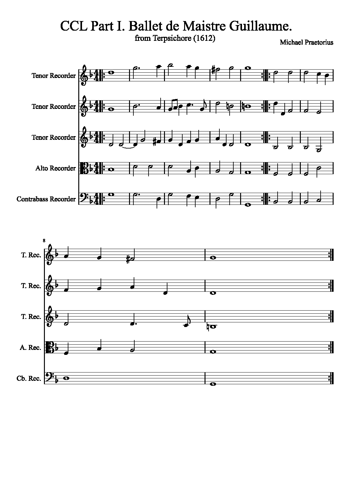 | Extra Information | These pieces were assembled and arranged by Praetorius for his 1612 collection. It is unknown how many, or if any, of the works in the collection were actually composed by Praetorius as opposed to being popular dance tunes arranged by him. The instrumentation is not specified in the original, and simply listed as "à 5". |