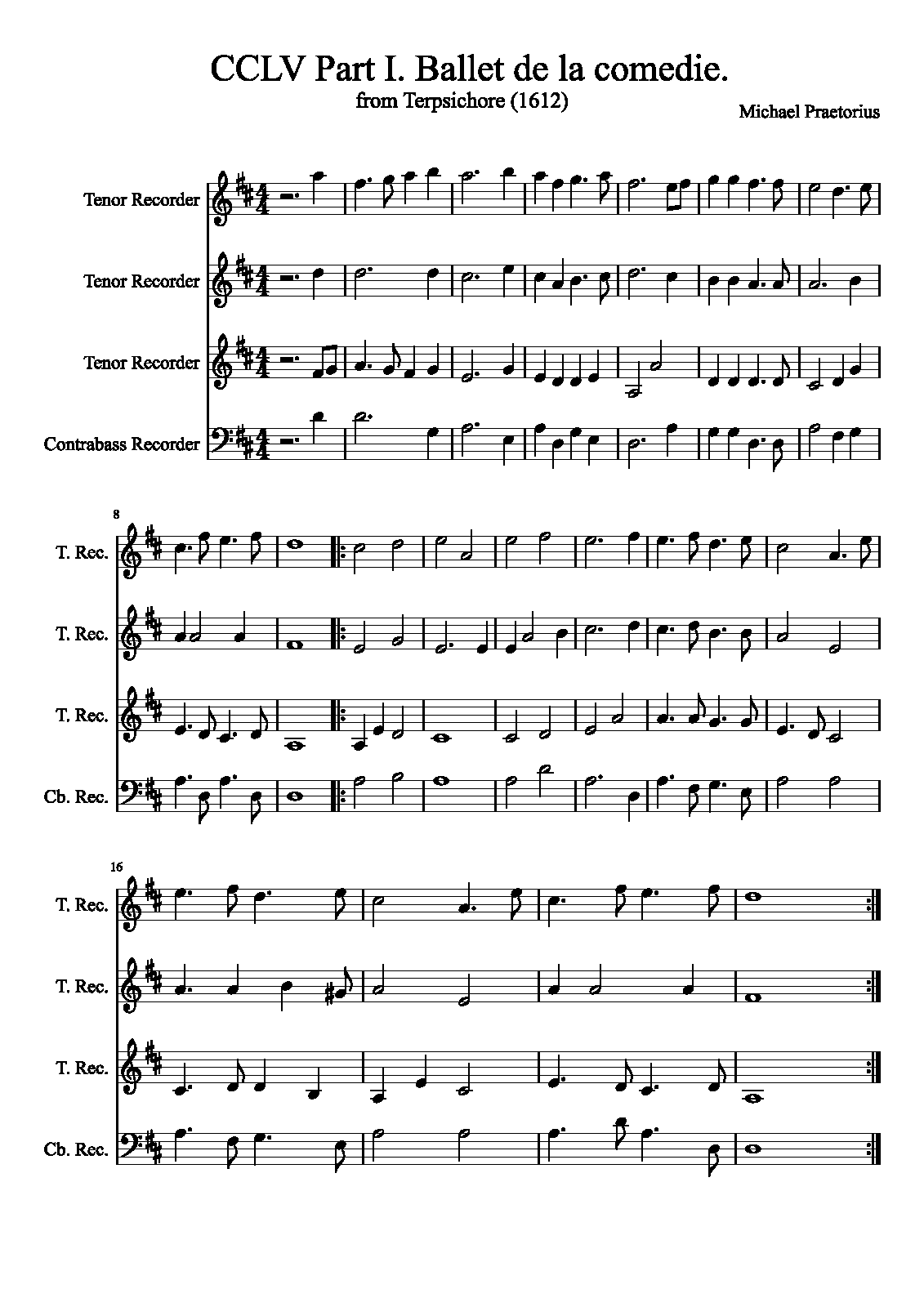 | Extra Information | These pieces were assembled and arranged by Praetorius for his 1612 collection. It is unknown how many, or if any, of the works in the collection were actually composed by Praetorius as opposed to being popular dance tunes arranged by him. The instrumentation is not specified in the original, and simply listed as "à 4". |