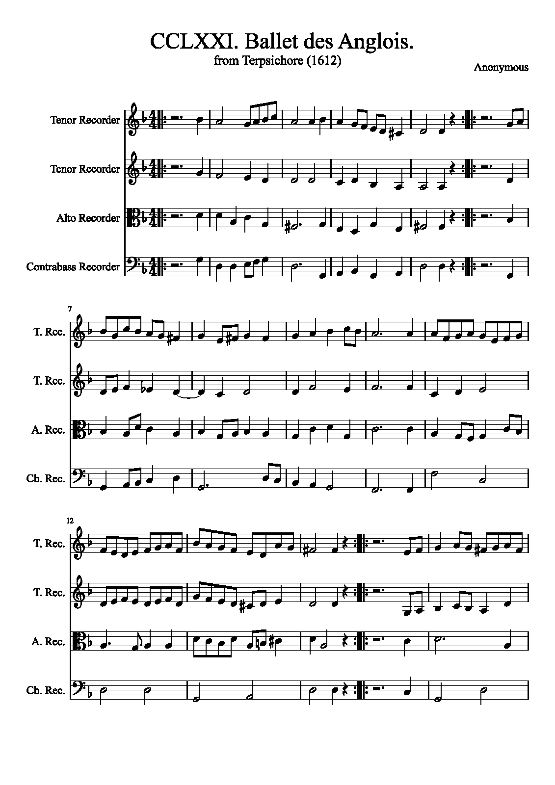 | Extra Information | These pieces were assembled and arranged by Praetorius for his 1612 collection. It is unknown how many, or if any, of the works in the collection were actually composed by Praetorius as opposed to being popular dance tunes arranged by him. The instrumentation is not specified in the original, and simply listed as "à 4". |